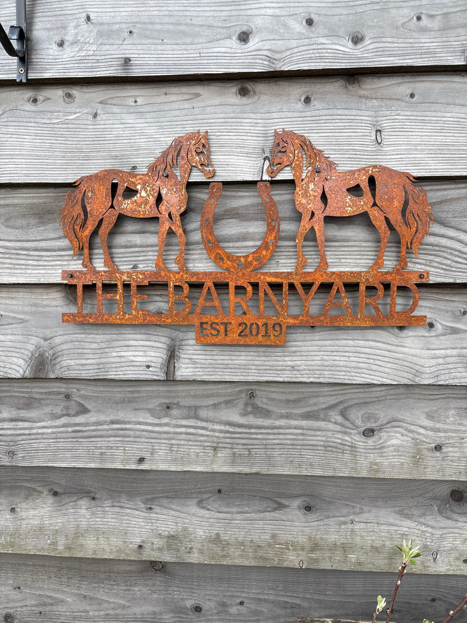 The image depicts a rusty metal sign affixed to a weathered, grey wooden fence. The sign features two horses facing opposite directions, a horseshoe in the center, and the name "RINARD" vertically ali…read more