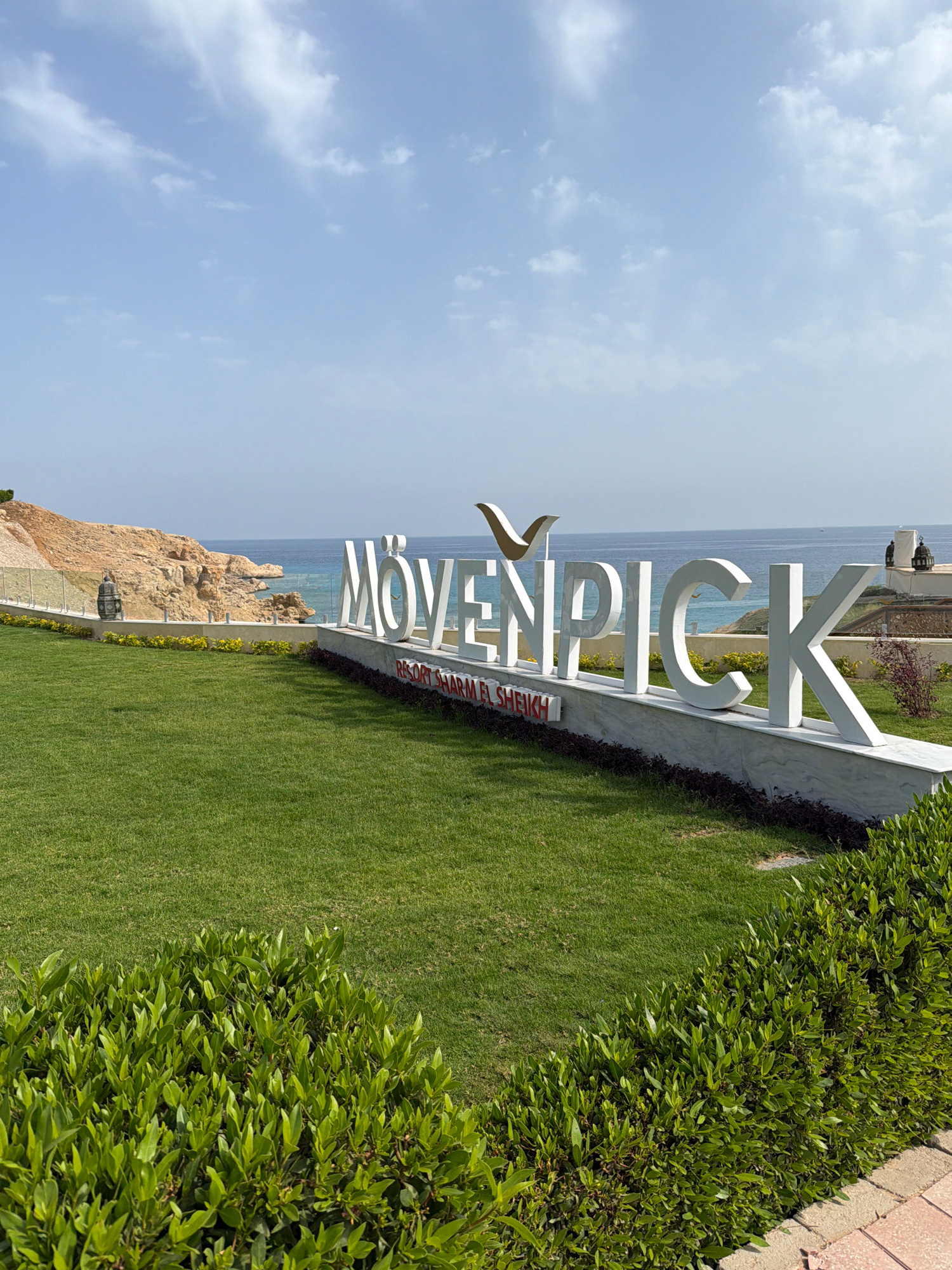 This image captures a scenic view of a coastal resort, correctly oriented as a landscape. In the foreground, a large, white, three-dimensional sign spells out "MÖVENPICK". Beneath these prominent lett…read more