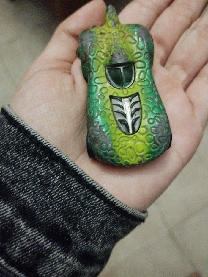 A person holds a toy car in their hand. The toy is green and silver with a textured surface resembling scales or bubbles. It features a central vertical design element with a silver, leaf-like pattern…read more