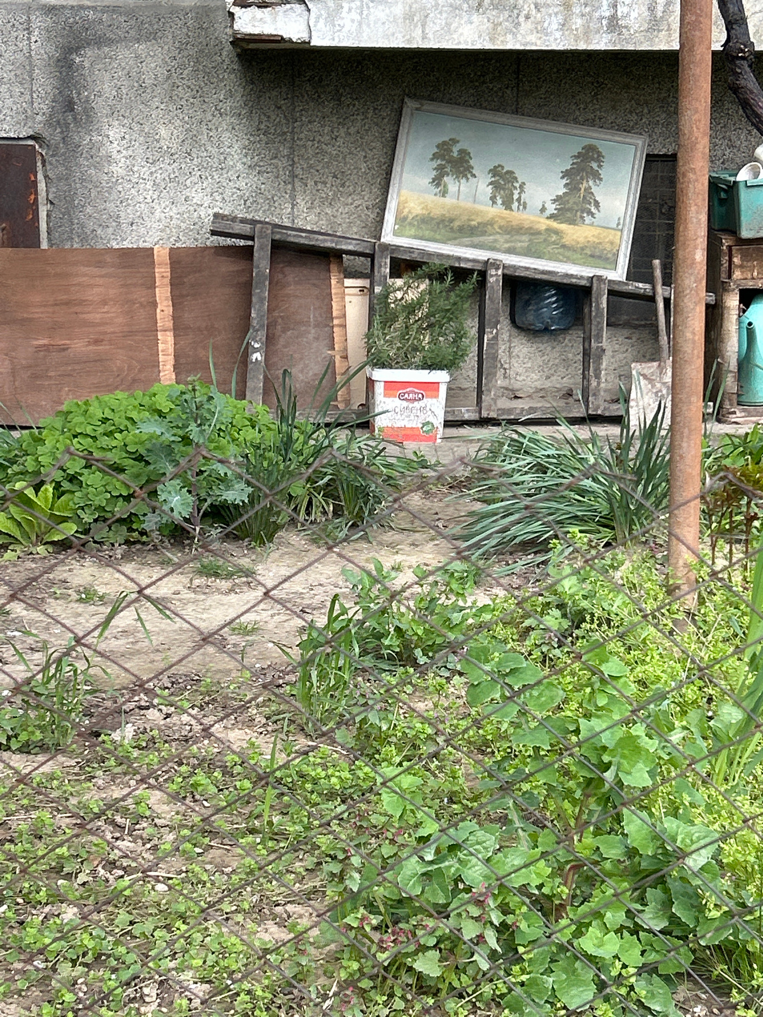 The scene depicts a cluttered outdoor area near a building in Plovdiv, Bulgaria. Visible is a chain-link fence, behind which lies a dirt path overgrown with various types of green vegetation. Adjacent…read more