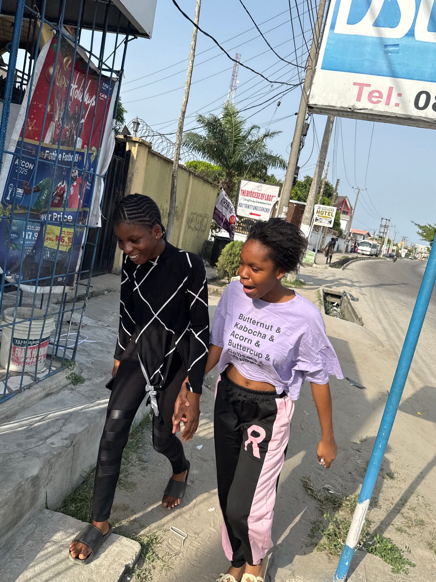 The image depicts two women standing close to each other outdoors. The woman on the right wears a light purple shirt with the words "Butternut & Kabocha & Acorn & Buttercup & Delicata & Hipba." She ha…read more