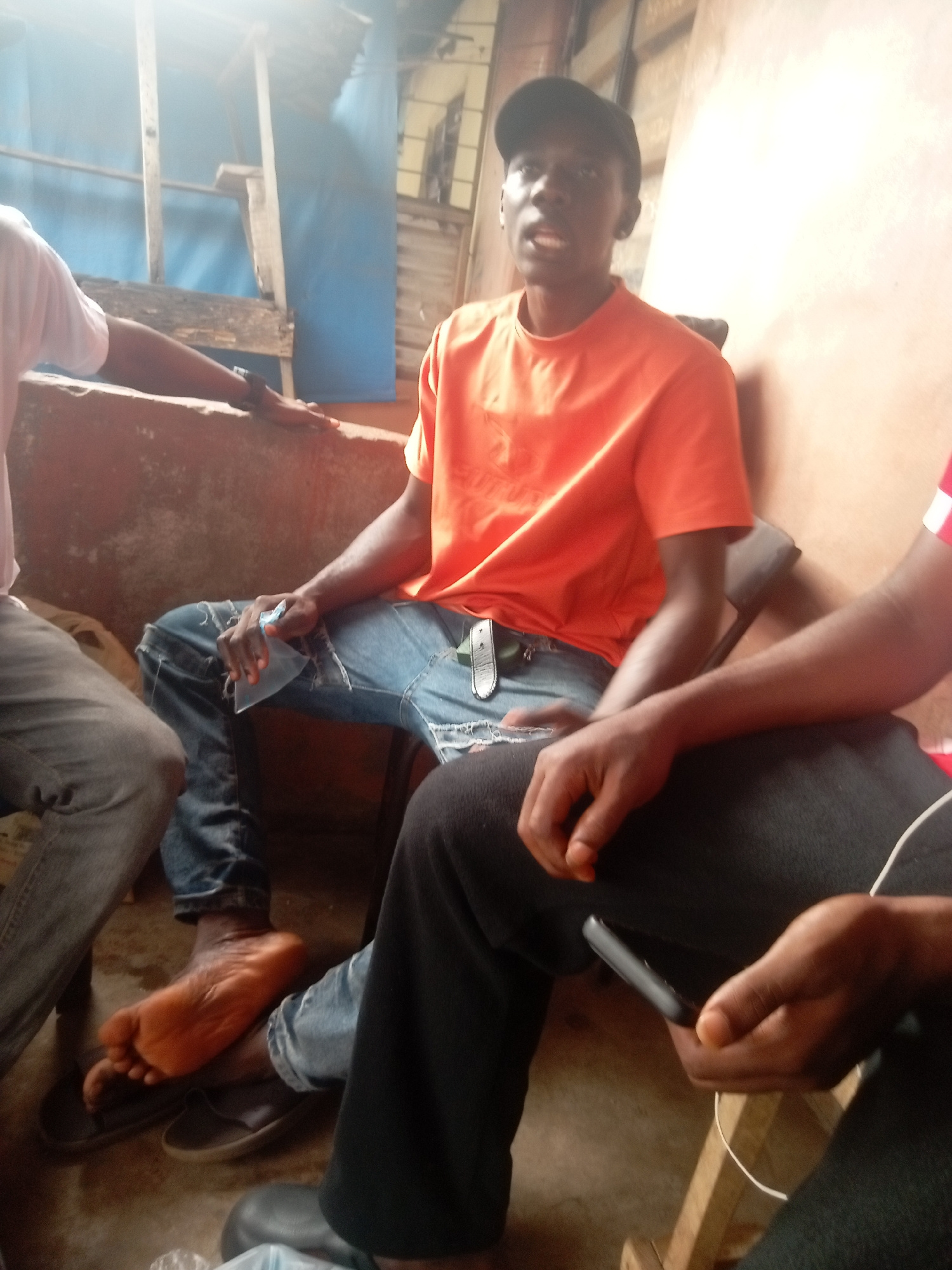 The image depicts four individuals in an indoor setting in Nkpor, Nigeria. The central figure, a young Black man, is seated on a chair, wearing an orange t-shirt and ripped jeans with a black cap. He…read more