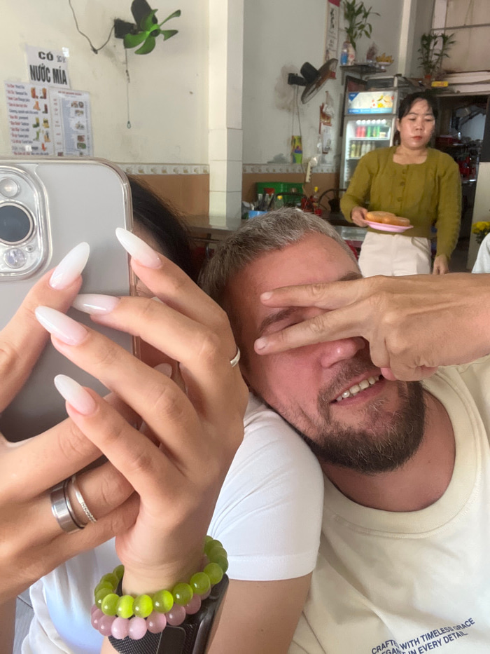A selfie shows a person with long, white nails holding a phone. Two silver rings and a beaded bracelet decorate their hand. Behind them lies a bearded man wearing a white t-shirt, making a playful ges…read more