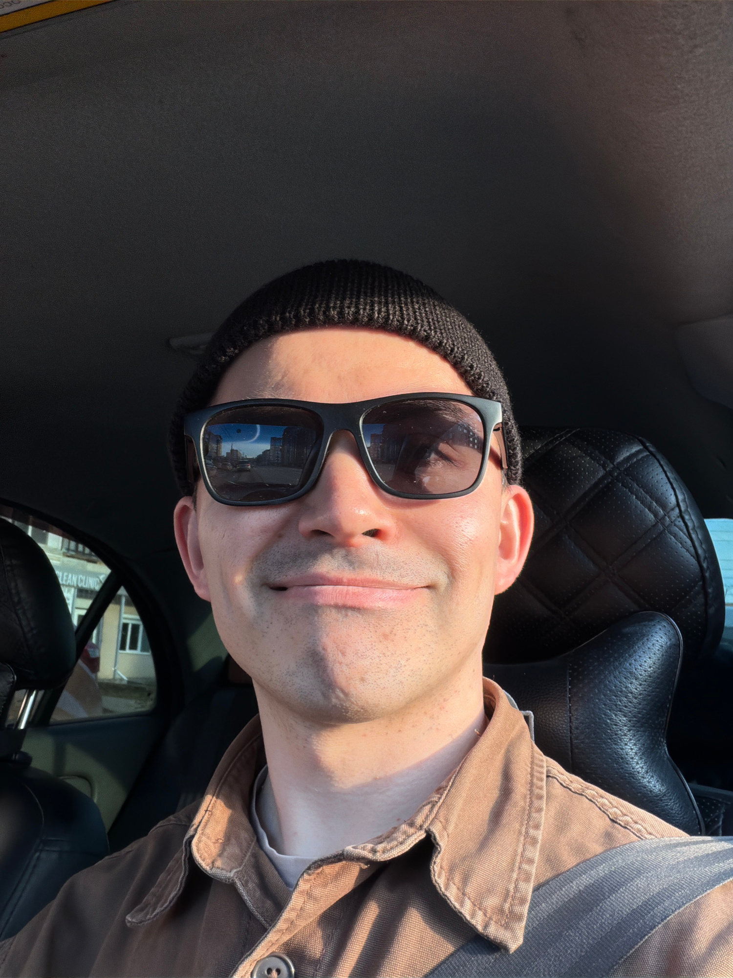 A man wearing sunglasses and a beanie is in a car. He is wearing a brown jacket and a seatbelt. Reflected in his sunglasses are buildings, possibly in Izhevsk, Russia, based on the reversed sign menti…read more