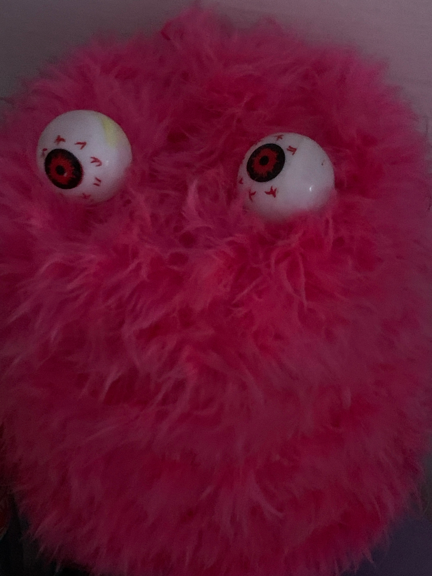 The image displays a close-up of a vibrant pink, fluffy, and seemingly spherical or amorphous object. This object is covered in soft, long, light pink fibers, giving it a textural, cloud-like, or mons…read more