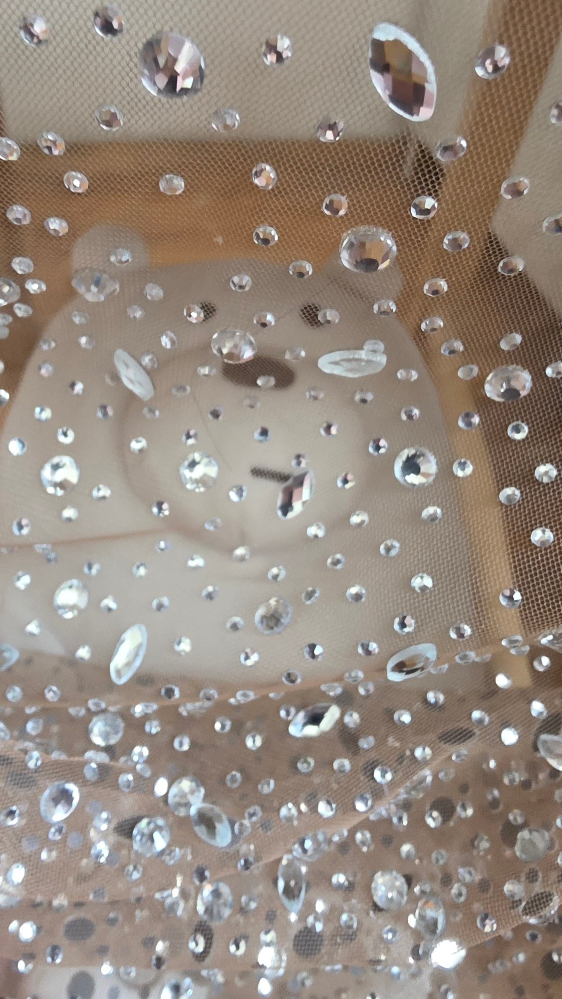 This close-up image features a light brown or nude-colored sheer mesh fabric, densely embellished with numerous clear, faceted rhinestones of various sizes and shapes. The rhinestones include round, o…read more