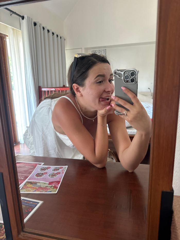 A young woman takes a selfie in a mirror. She holds an iPhone with a gray case. She wears a white top and a pearl necklace, and her black hair is pulled back. The room's interior is reflected in the m…read more
