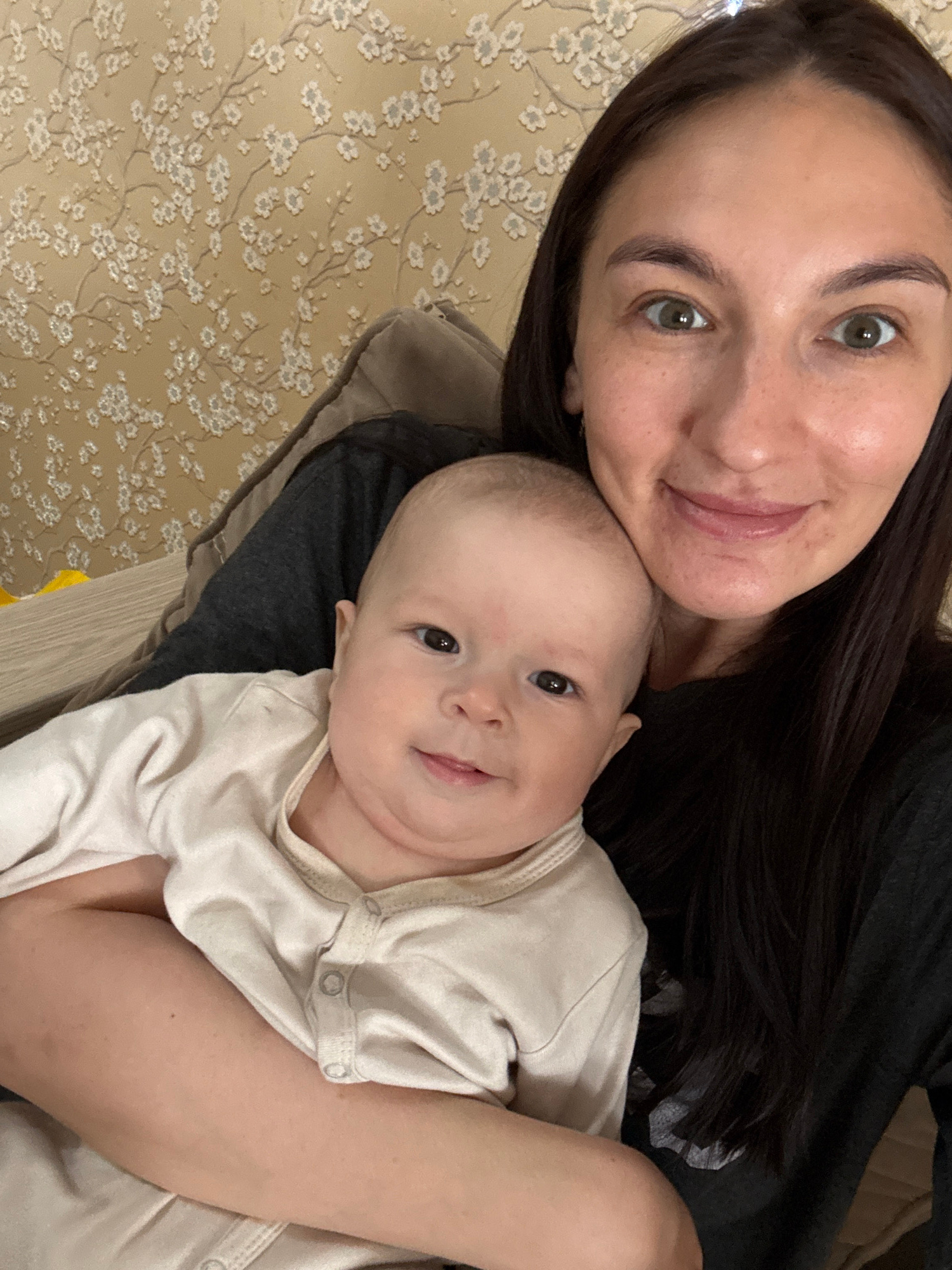 A woman with dark hair and fair skin is taking a selfie with a baby. The baby is wearing a white onesie and is lying on the woman's chest. The woman is smiling at the camera. The background appears toβ¦read more