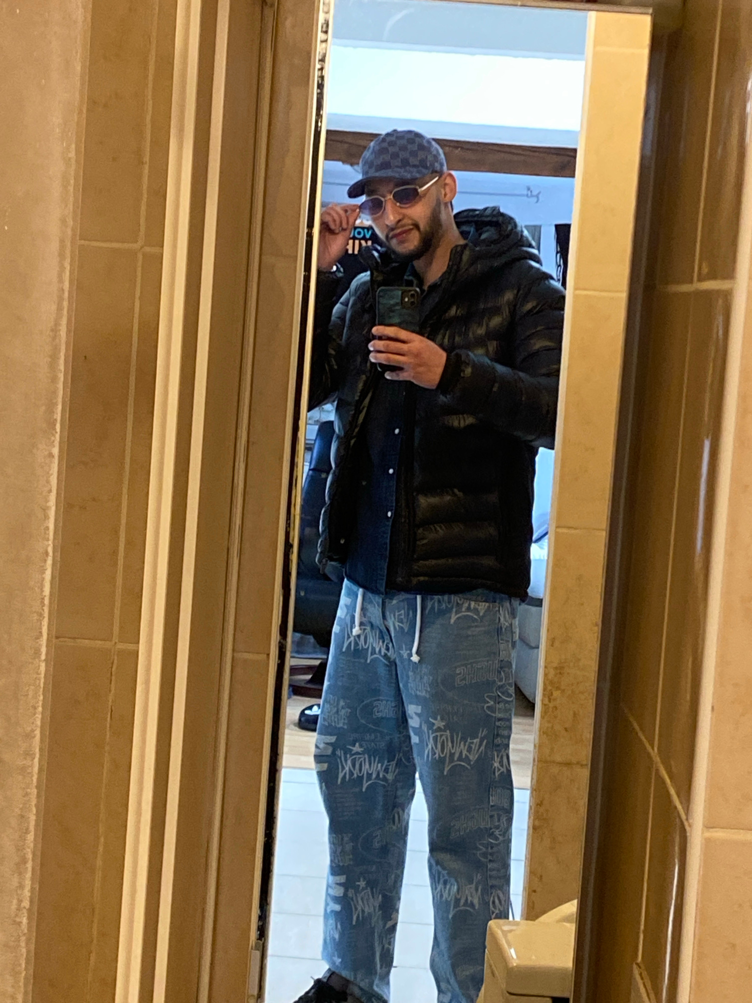 A person stands in front of a mirror, taking a photograph of themselves with a mobile phone. The individual is wearing a patterned hat, sunglasses, a black puffer jacket over a blue denim jacket, and…read more