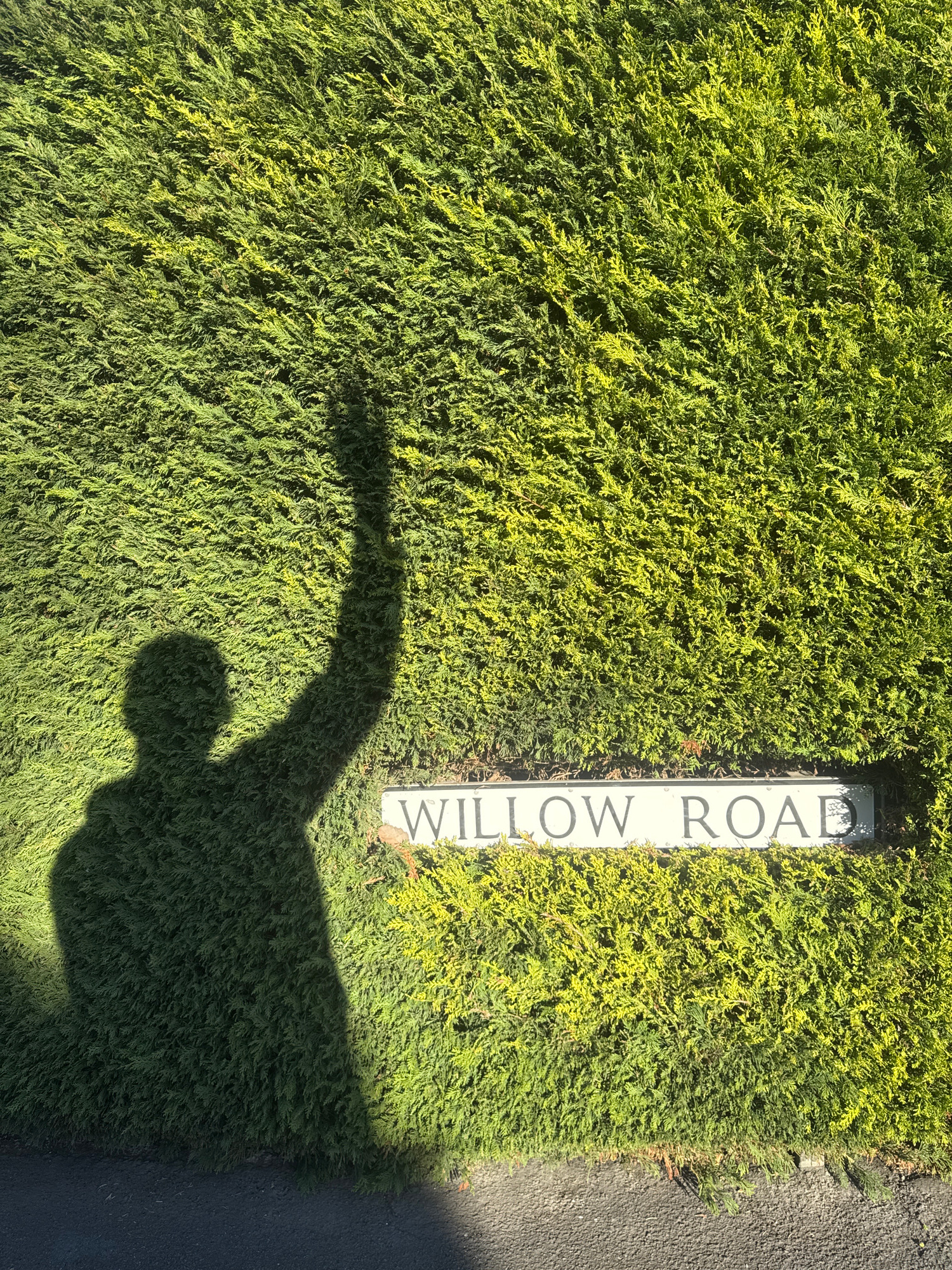 The image shows a hedge with a street sign reading "Willow Road." A shadow, possibly of a person holding a long object, falls across the hedge and sign. The location is presumed to be somewhere within…read more