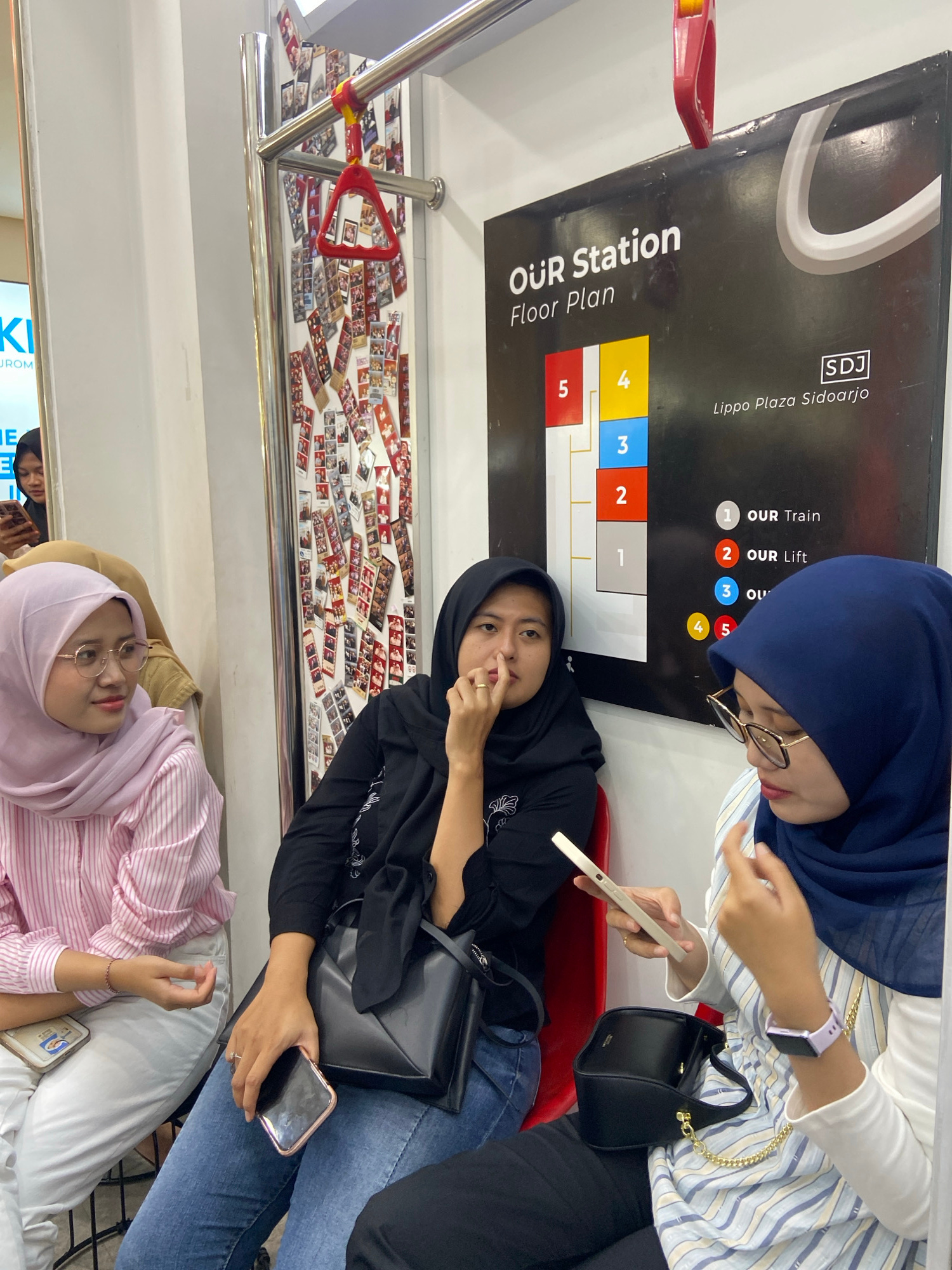 Three young women are captured in an indoor setting, likely a train or subway in Sidoarjo, Indonesia. The woman in the lower part of the image wears a light pink hijab and striped shirt, lying back on…read more