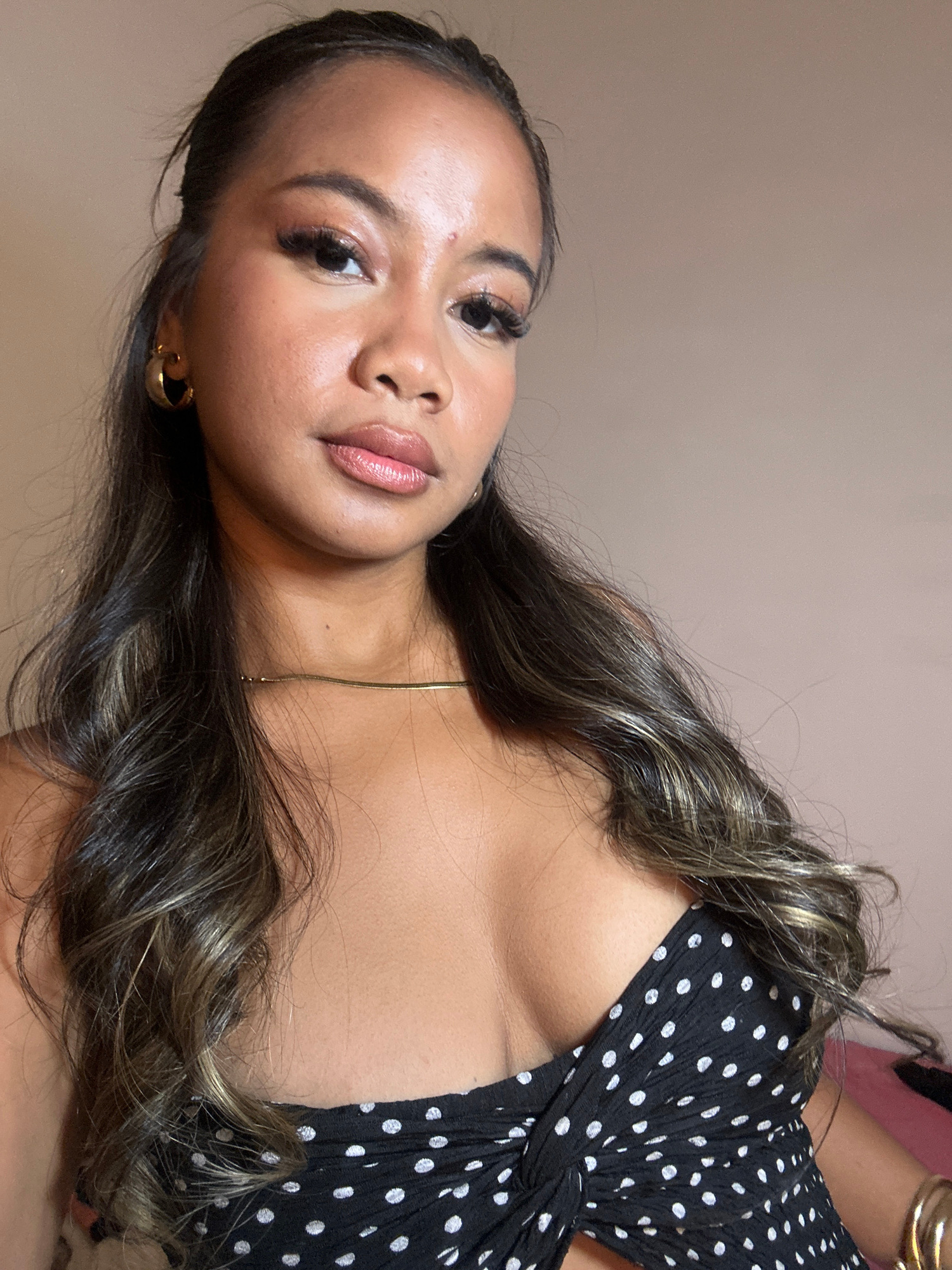 A medium-angle shot of a woman. Her dark, wavy hair is styled and features light brown highlights. She wears gold hoop earrings and a thin gold necklace. The upper portion of her body is visible, andβ¦read more