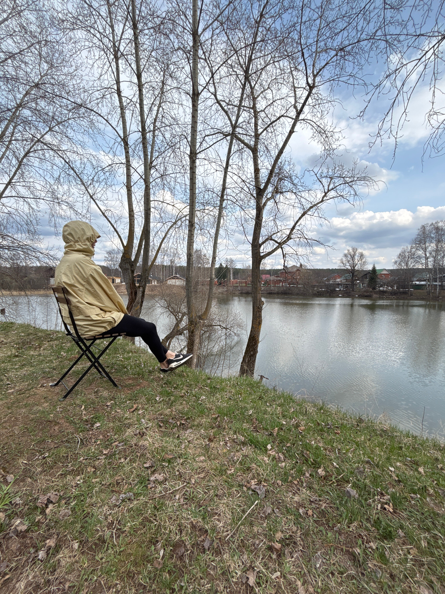A person sits in a folding chair on a grassy bank next to a body of water, possibly a pond or lake. The person is wearing black leggings, black and white sneakers, and a light brown hooded jacket. The…read more