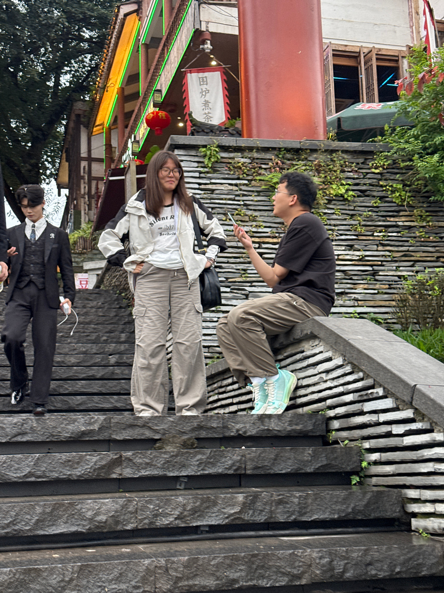 The image depicts a group of people on a street in what appears to be Shapingba District, China. A man in a black t-shirt and brown pants is leaning against a stone wall, looking at his phone. A woman…read more