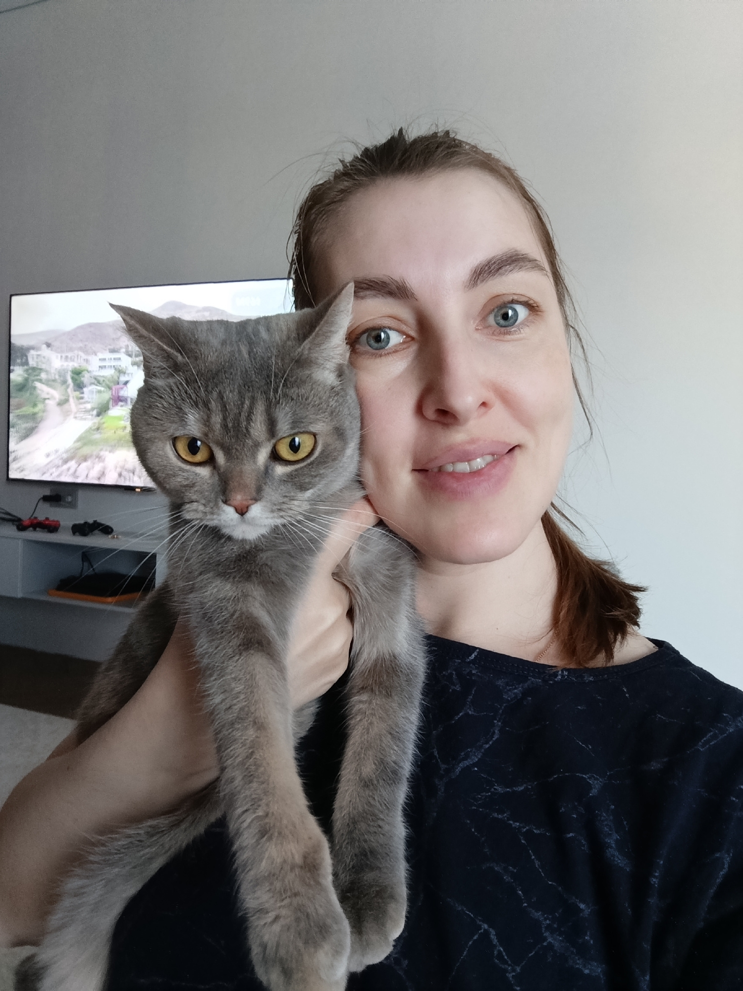 A woman and a gray cat are in the frame. The woman is fair-skinned with blue eyes and light brown hair pulled back in a low ponytail. She is wearing a dark, possibly marble-patterned, top. She is smil…read more