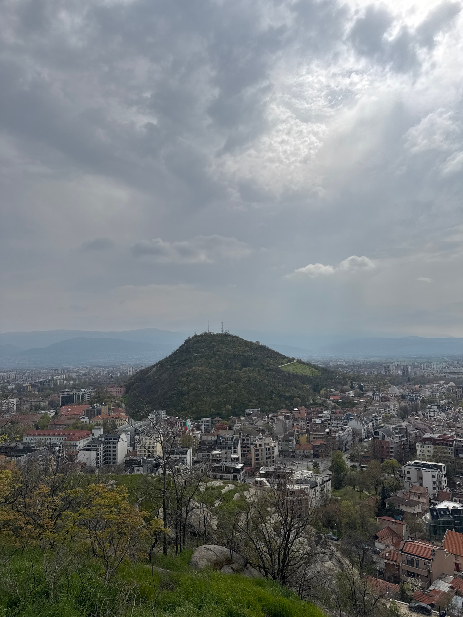 The image depicts a high-angle view of the city of Plovdiv, Bulgaria, likely captured from the top of a hill. The sky is overcast with grey clouds. A large, green, forested hill rises prominently in t…read more