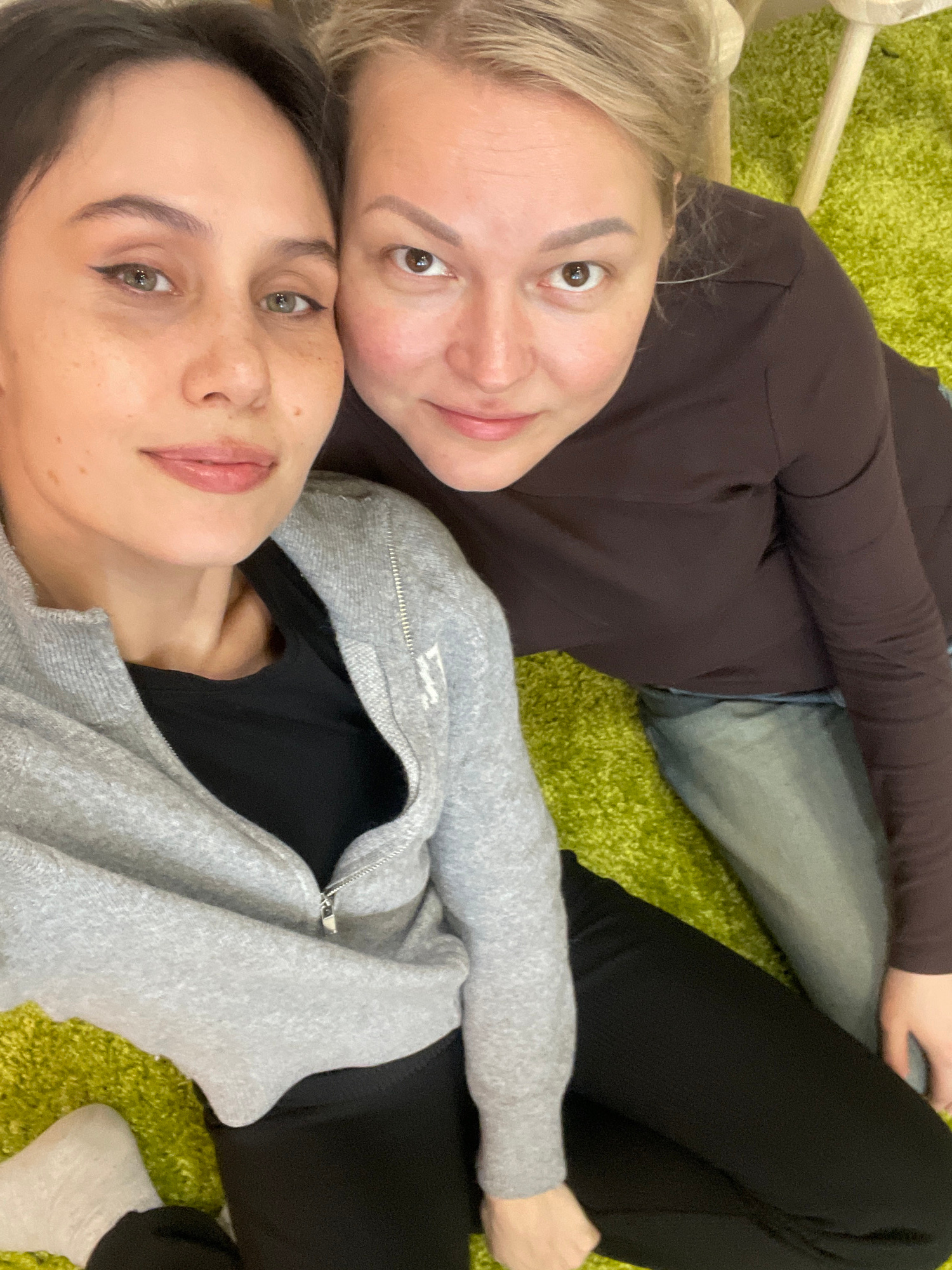 Two women are lying on a green rug indoors. The woman on top has blonde hair, a brown long-sleeved shirt, and blue jeans. The woman below has dark hair and wears a grey zip-up hoodie over a black shir…read more