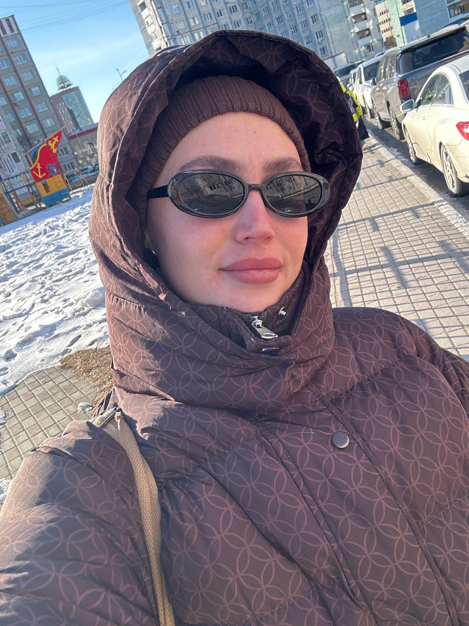 A person wearing a brown puffer jacket with a hood and dark sunglasses is taking a selfie outdoors. The person is also wearing a brown beanie. The background features a cityscape including apartment b…read more
