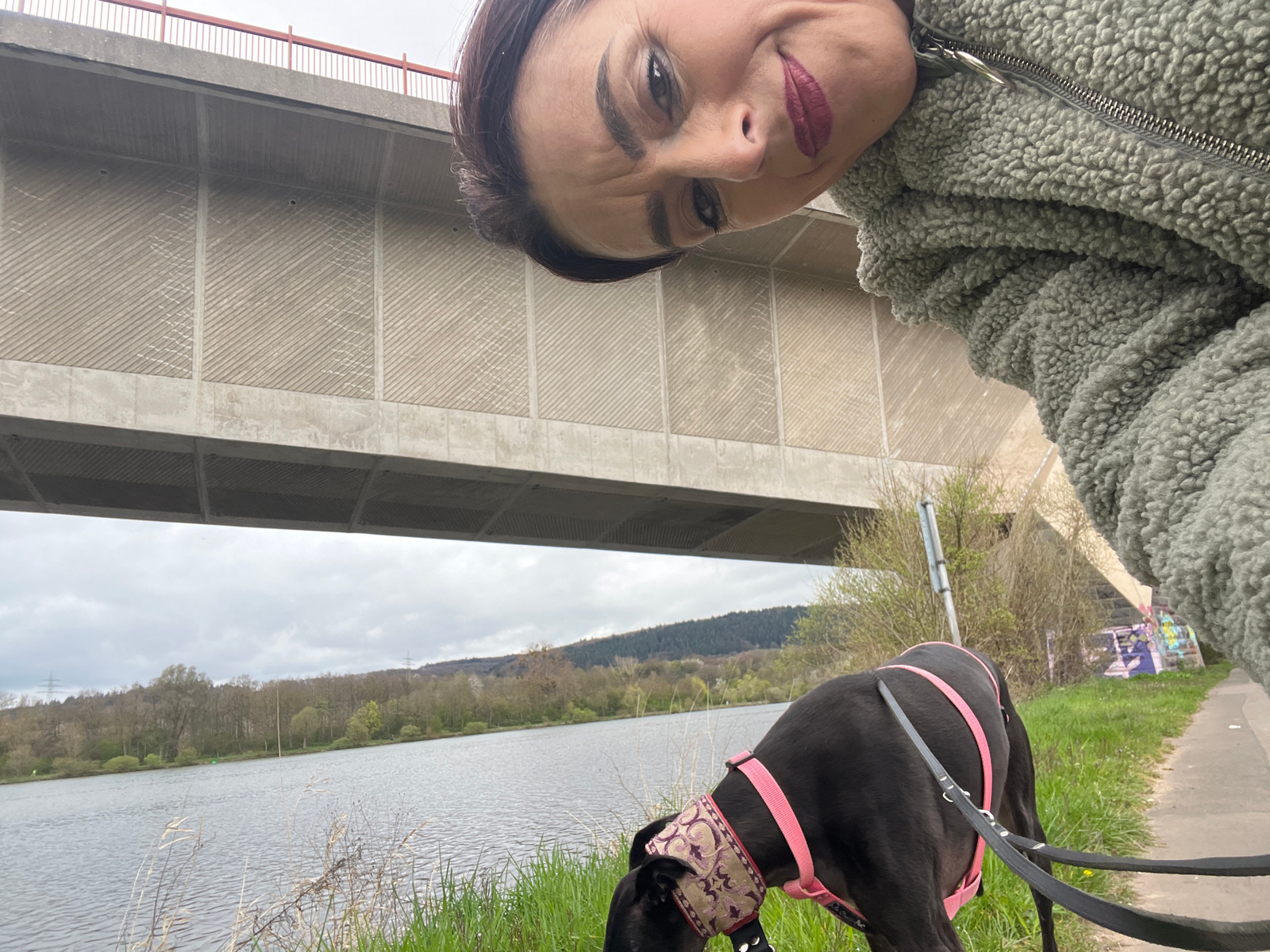 A woman is taking a selfie with a black dog on a leash, potentially in Konz, Germany, based on the presence of the Konz Bridge. The dog is wearing a pink harness and ornate collar and is sniffing at t…read more