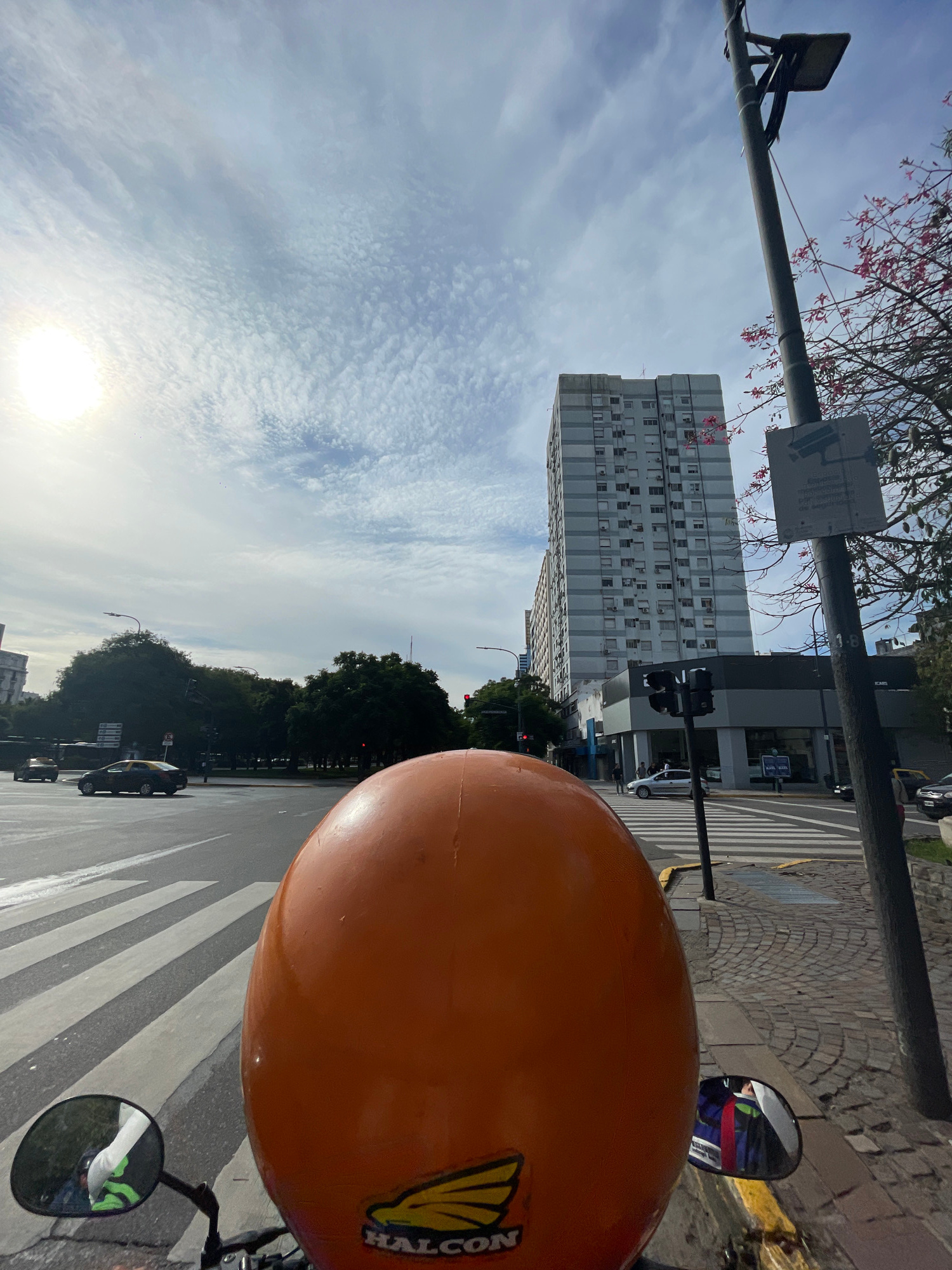 View from a motorcycle on a zebra crossing in Buenos Aires, Argentina. Tall building in the background. The sky is light blue with patterned clouds.