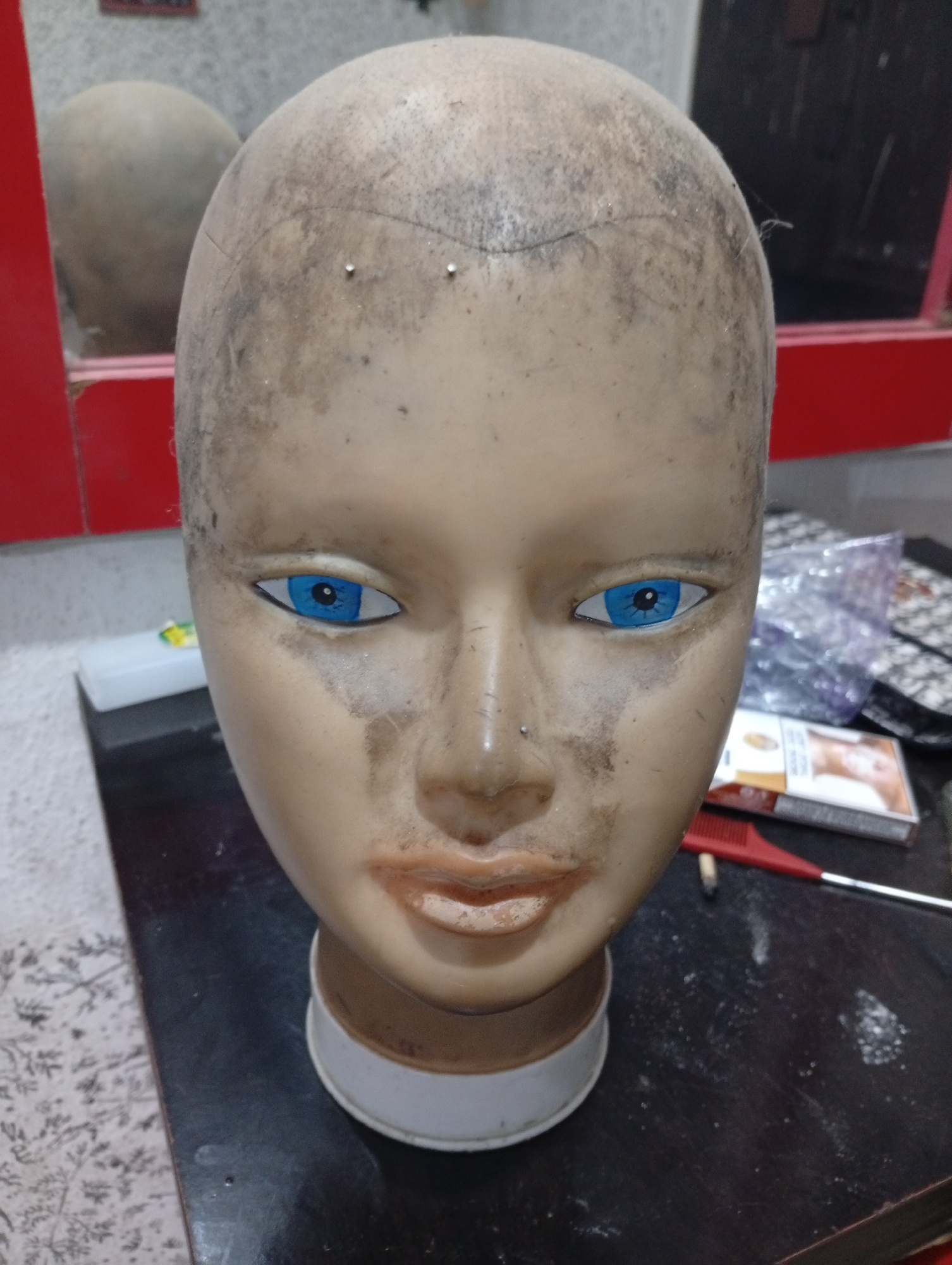 The image displays a head-on view of a worn, skin-toned mannequin head, likely situated in an indoor setting in Lokoja, Nigeria. The mannequin, made of plastic, exhibits significant signs of age and u…read more