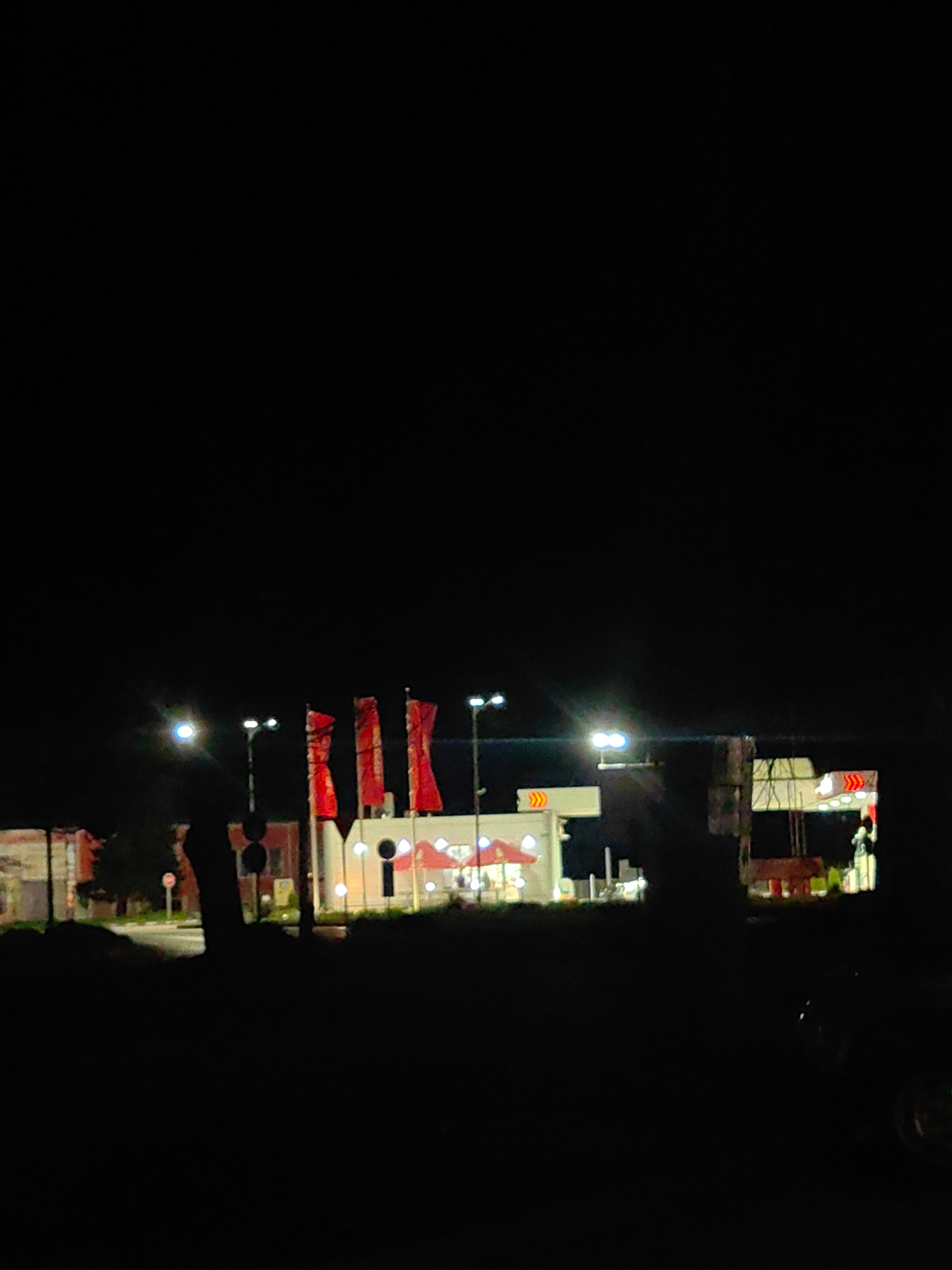 The image depicts a nighttime scene in Sevlievo, Bulgaria, likely taken from a distance. In the middle ground, there's a brightly lit area, possibly a commercial establishment, with red flags displaye…read more