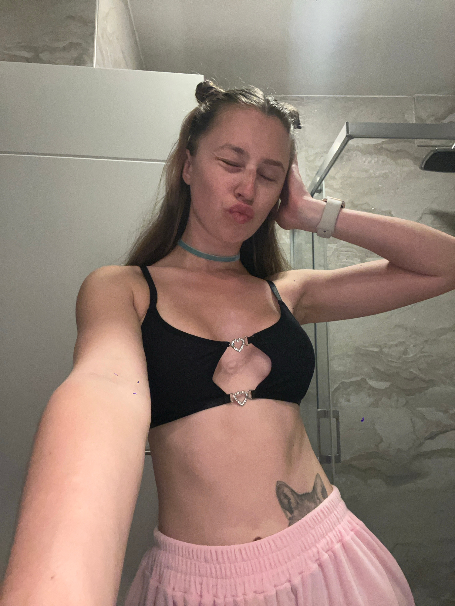 A woman lies in what appears to be a bathroom. She wears a black bra with heart-shaped details, pink sweatpants, and a light blue choker. Her hair is styled in two small buns. She has a tattoo on her…read more