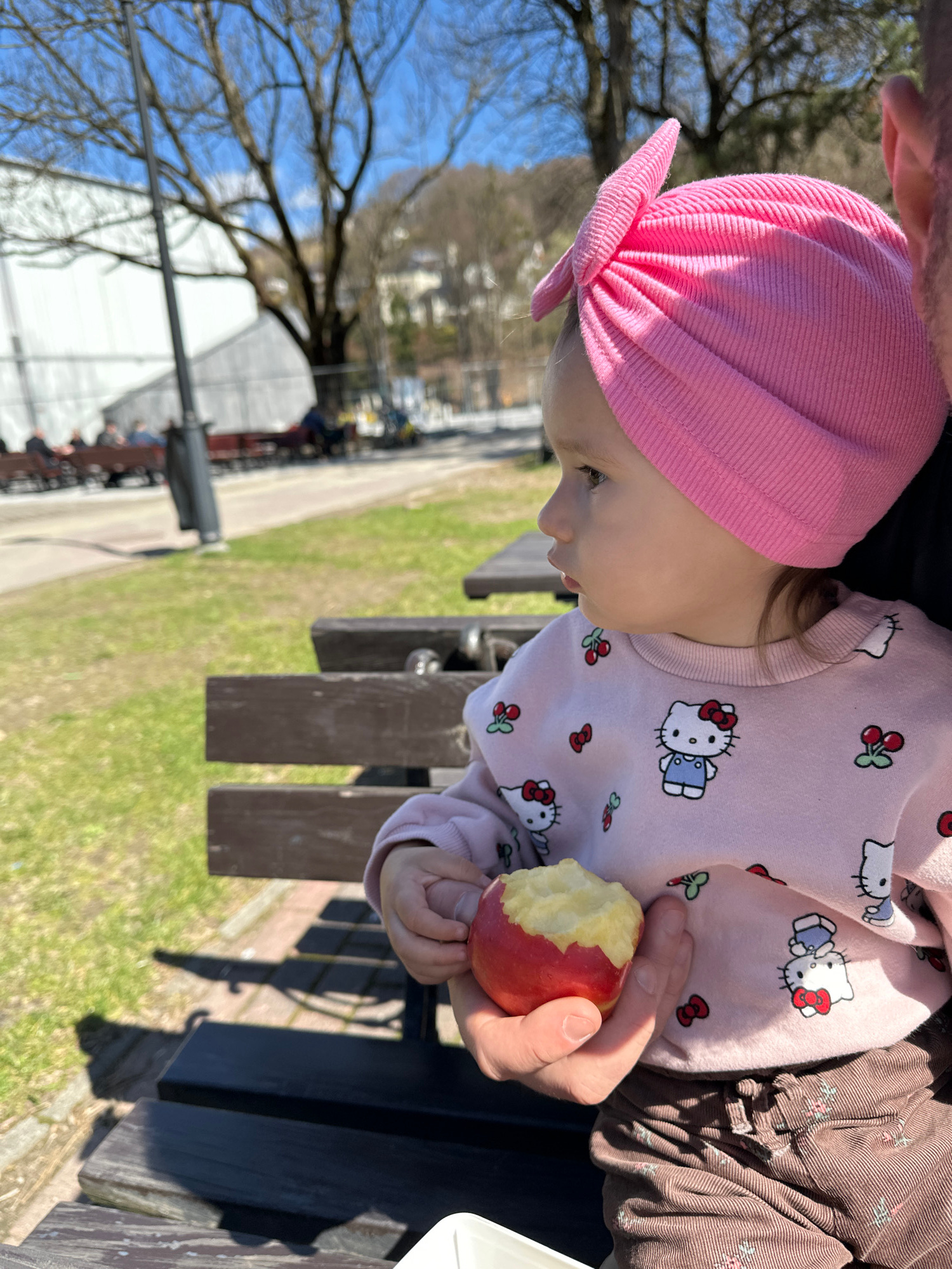 A child wearing a pink hat and Hello Kitty shirt sits on a park bench and eats an apple. A path and trees are visible in the background, and a park fence can be seen behind the trees. The location is…read more