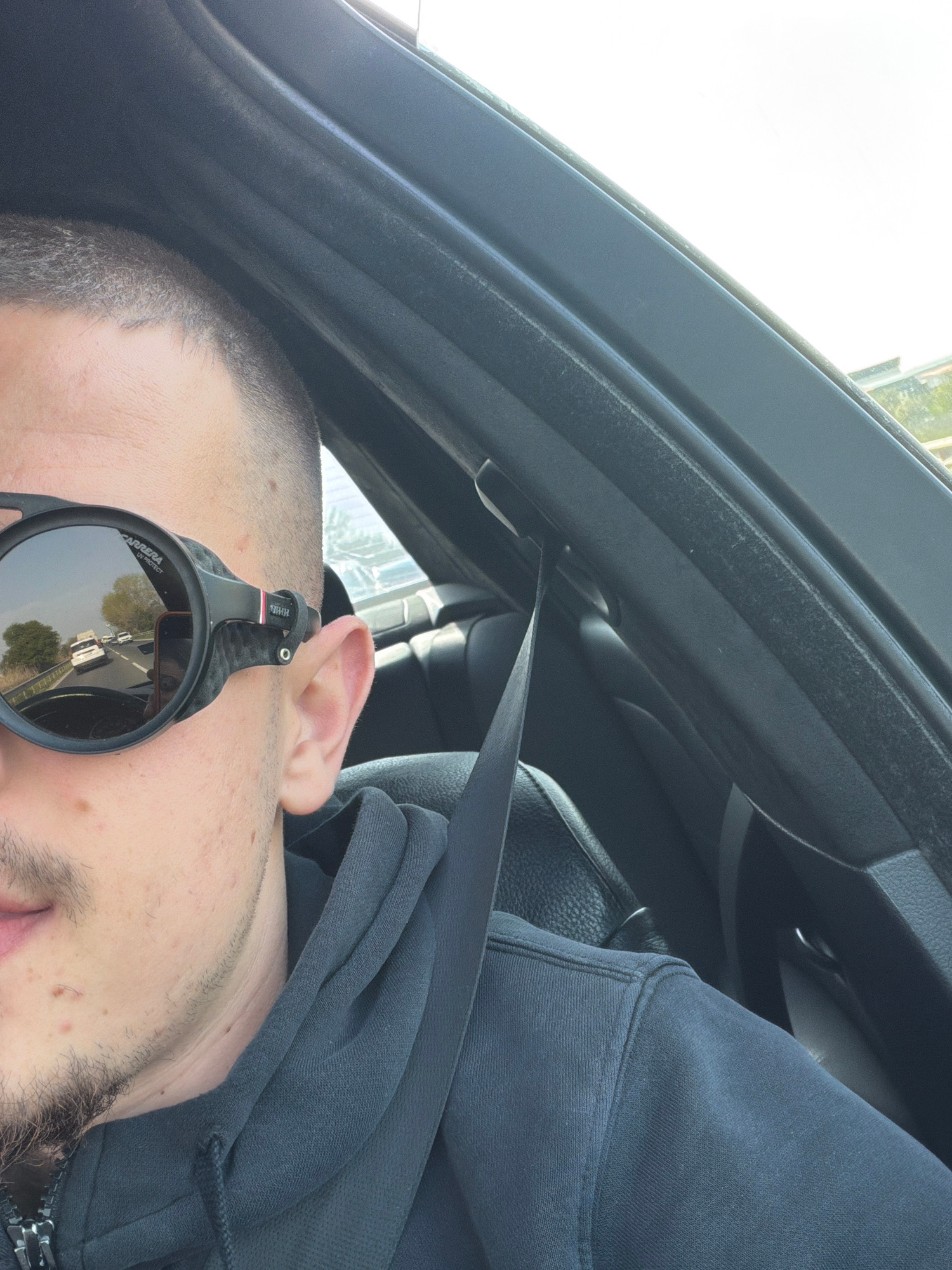 A close-up, tilted, indoor shot shows a person in a car. The person has short hair, fair skin, and is wearing sunglasses. A seatbelt crosses the person's body. The car's interior is visible, including the roof, seat, and dashboard. The sunglasses reflect a scene with trees and possibly other vehicles, but the location is not identifiable as Plovdiv, Bulgaria from the details provided. | Open Wire