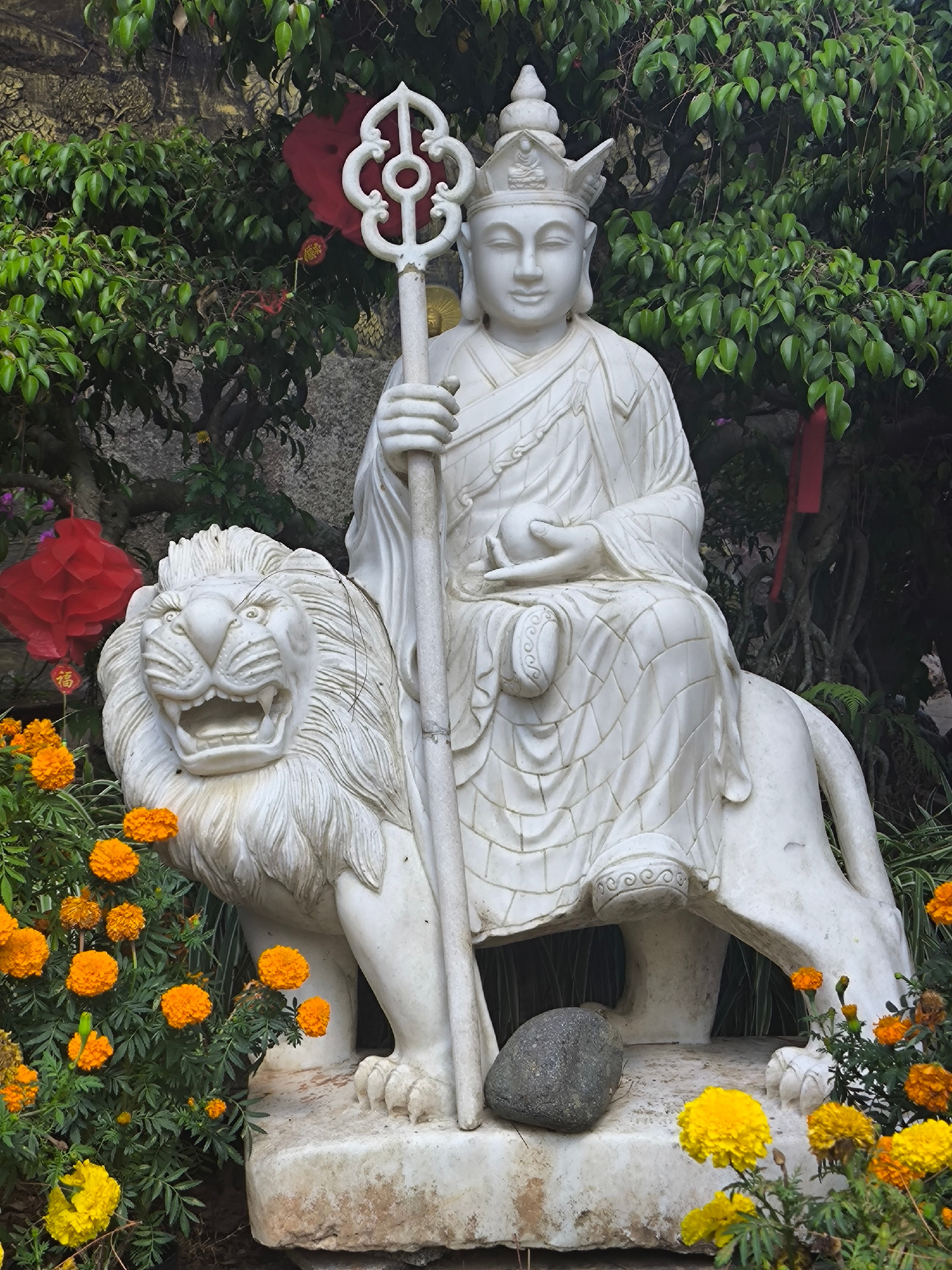 The image depicts a white marble statue of a Buddha-like figure seated atop a lion. The figure wears a crown-like headdress, has a serene expression, and holds a staff-like object with a circular desi…read more