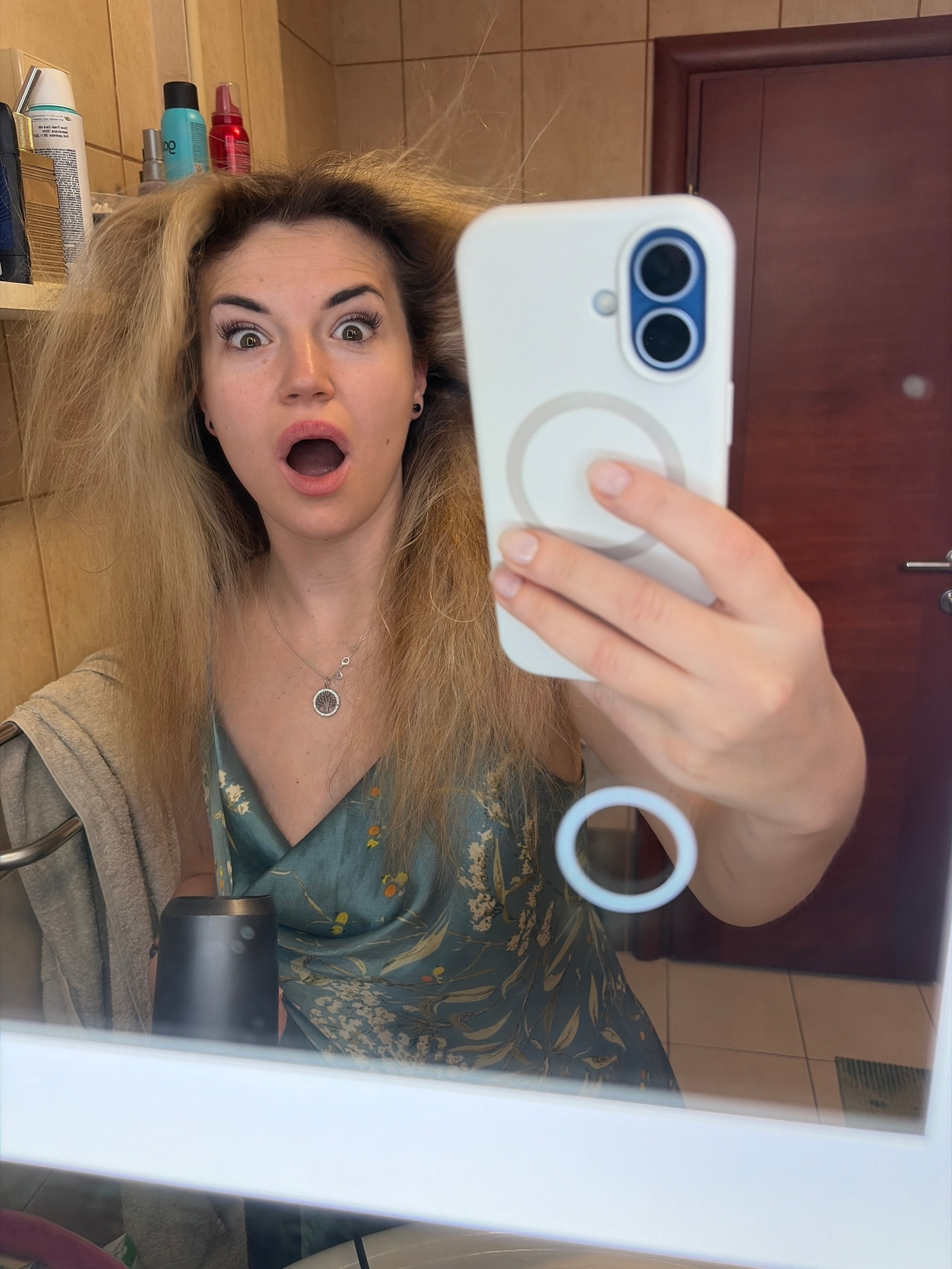 A person is taking a selfie in a bathroom mirror, holding a white phone with a circular charging port and two rear cameras. The background features a brown wooden door, tiled walls, and toiletries on…read more