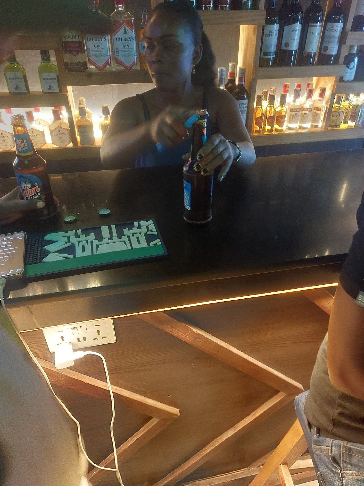 The image shows a bartender, likely in Dar es-Salaam, Tanzania, based on the "Safari Lager" bottle. The bartender is opening a bottle near the bar, where various alcohol bottles are displayed on shelv…read more
