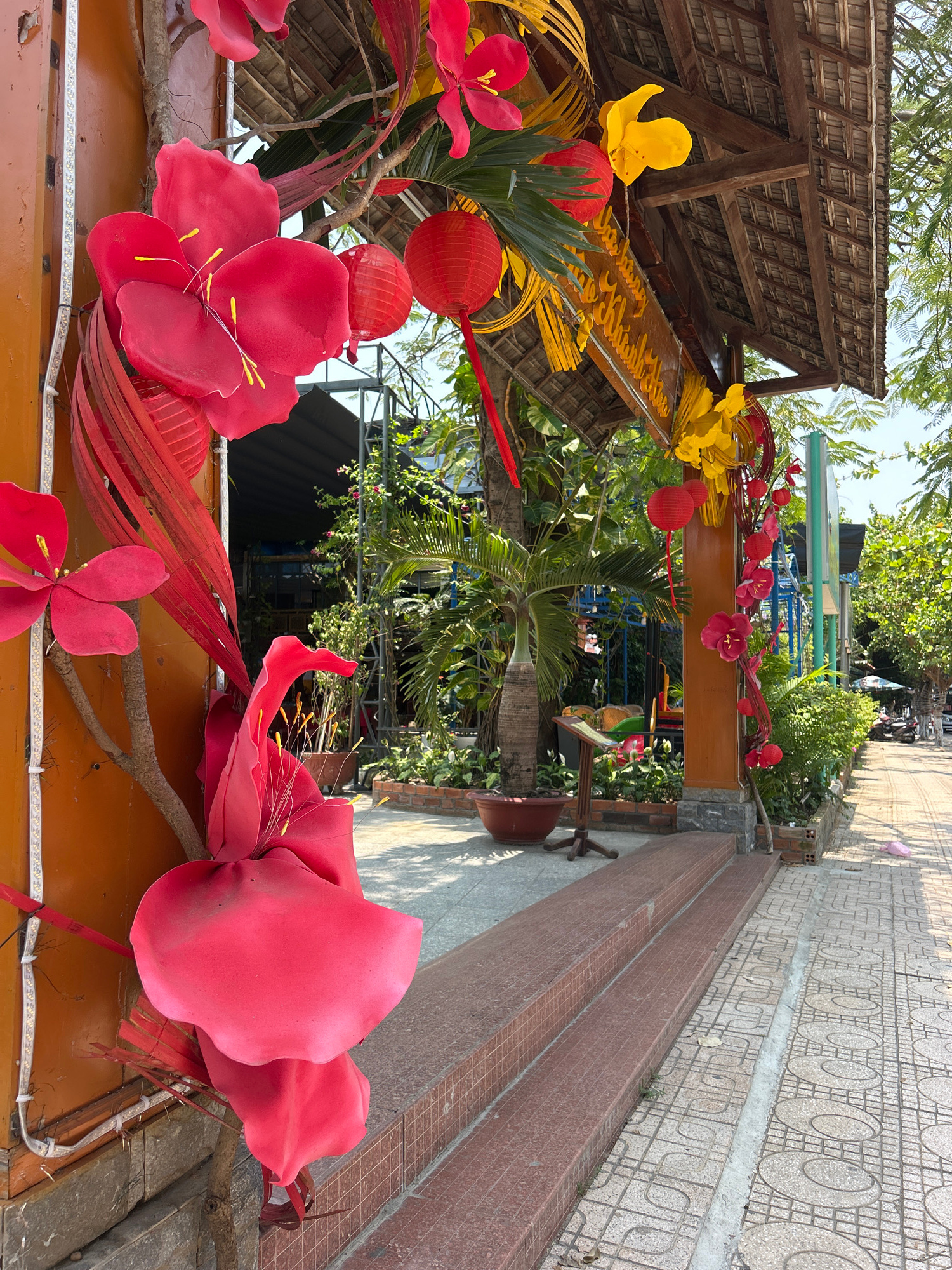 The image shows a street-level scene in what appears to be the city of Bắc Nha Trang, Vietnam. The view is oriented sideways, with the street running vertically. Along the right edge is a tiled walkwa…read more