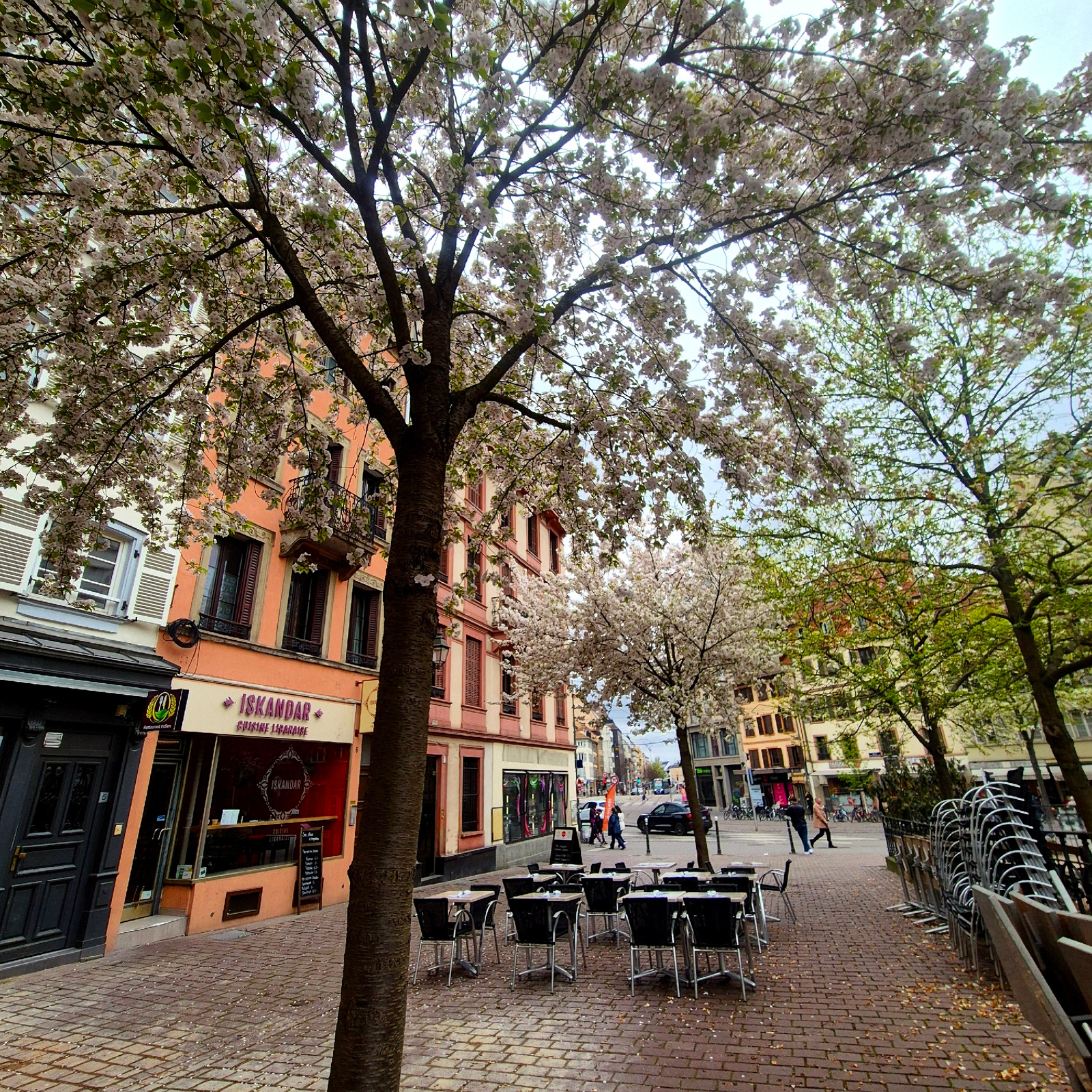 This image shows a street in Strasbourg, France, lined with buildings and blossoming trees. The sidewalk is brick and cluttered with fallen flower petals, also occupied by stacked chairs and outdoor c…read more