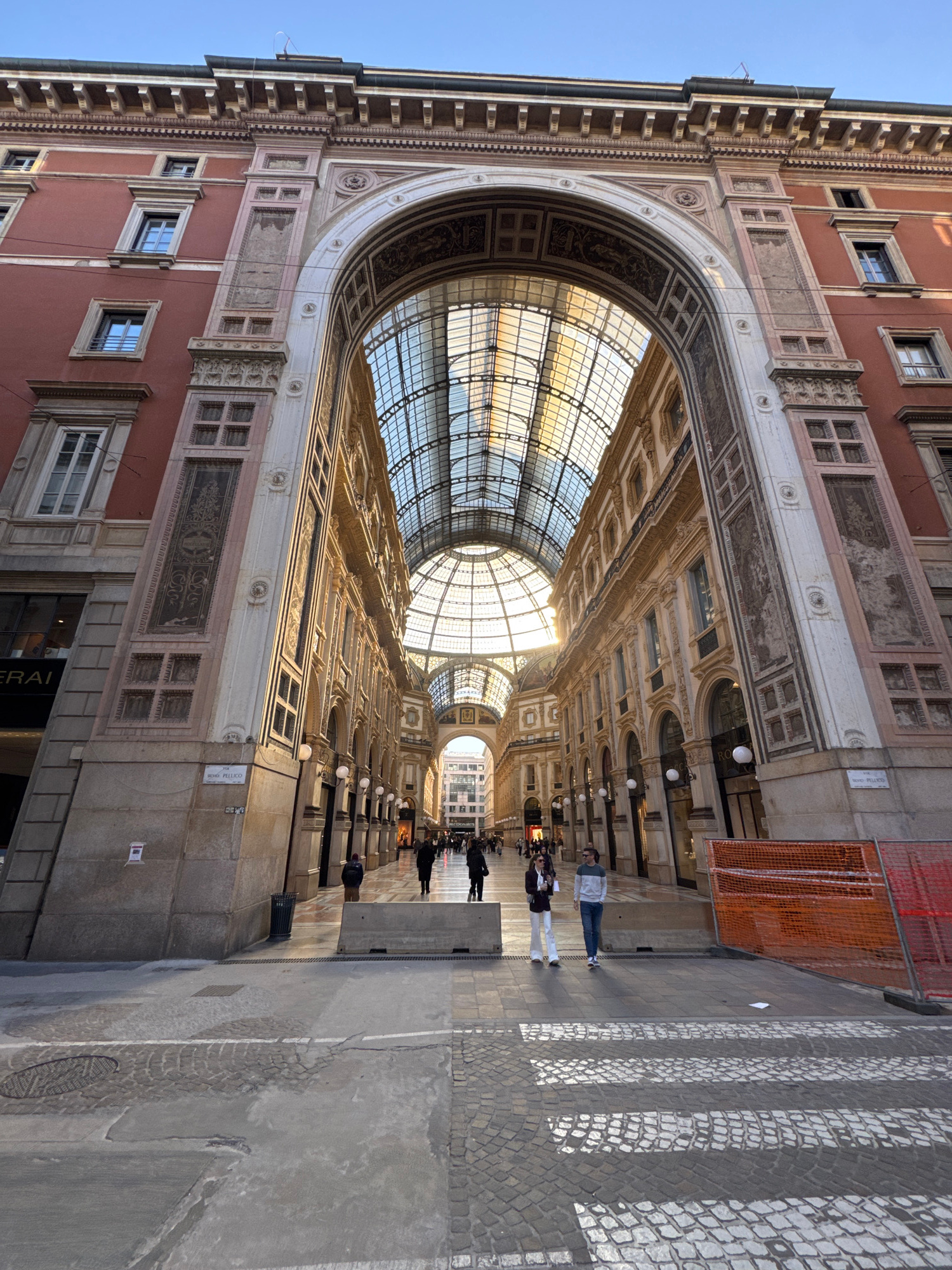 The image shows the Galleria Vittorio Emanuele II in Milan, Italy. This is a large, covered arcade with an iron and glass roof. The architecture is ornate and features detailed carvings and paintings.…read more