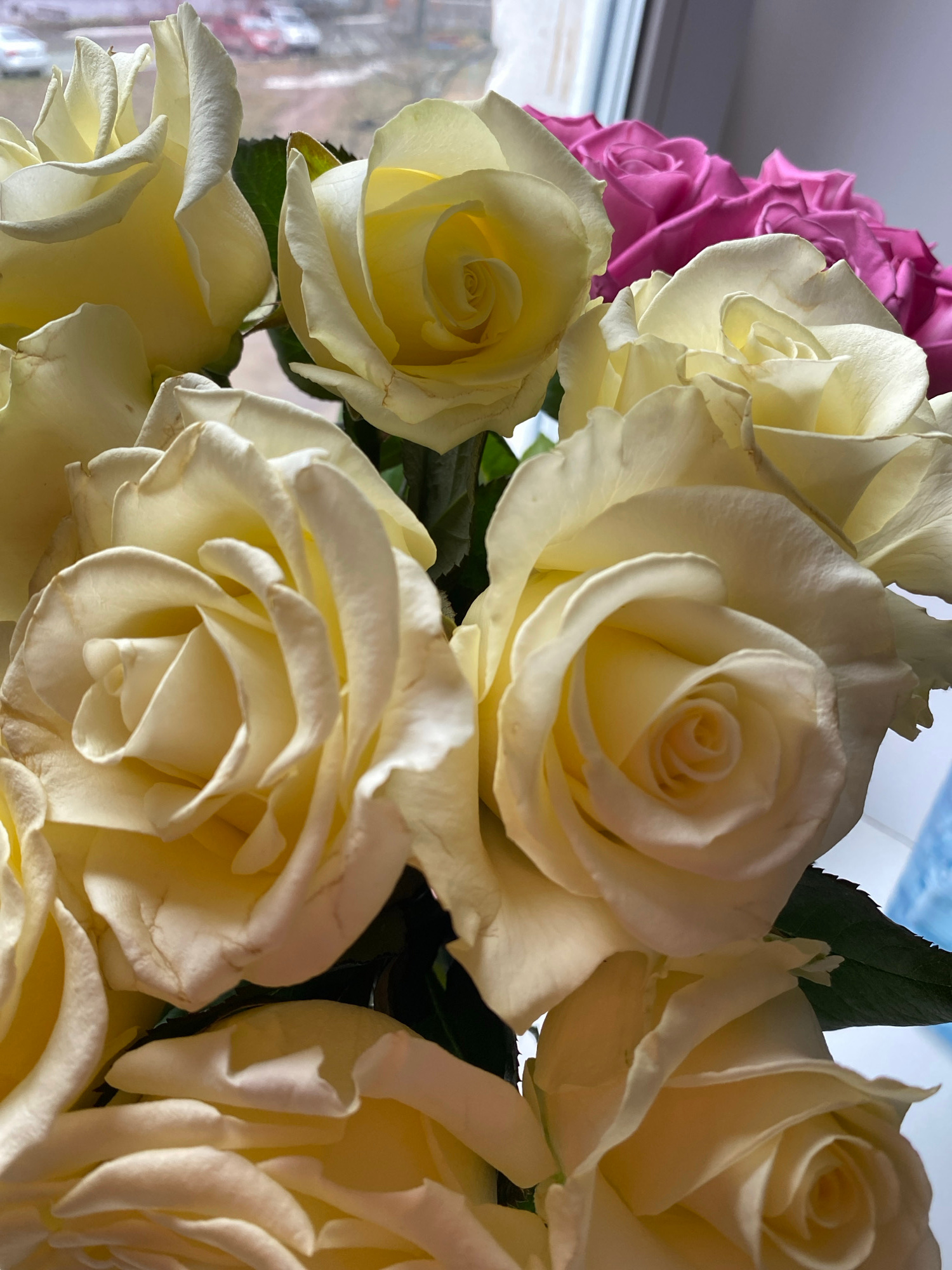 A close-up view of a bouquet of roses. Most roses are white with a hint of yellow. One group of roses on the left side is bright pink. Some green leaves are visible. The image was taken indoors, with part of a window visible in the upper right corner. There is no evidence to suggest this image was taken in Votkinsk, Russia. There are no people or actions visible in the image. | Open Wire