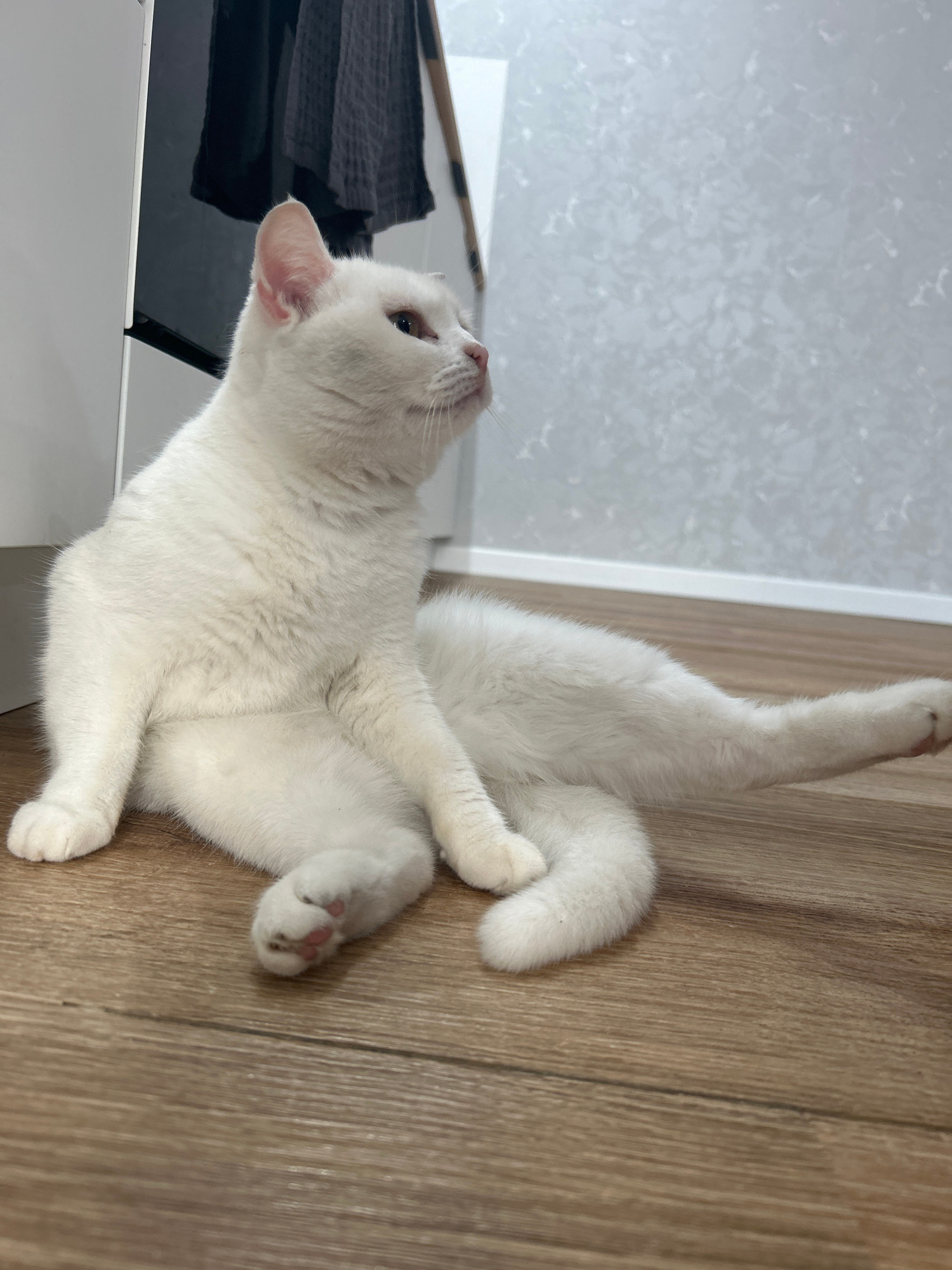 An all-white cat is captured in an indoor setting, lying on its back and side on a light brown wooden floor. The cat's body is stretched out, with its front paws bent and one back leg extended upwards…read more