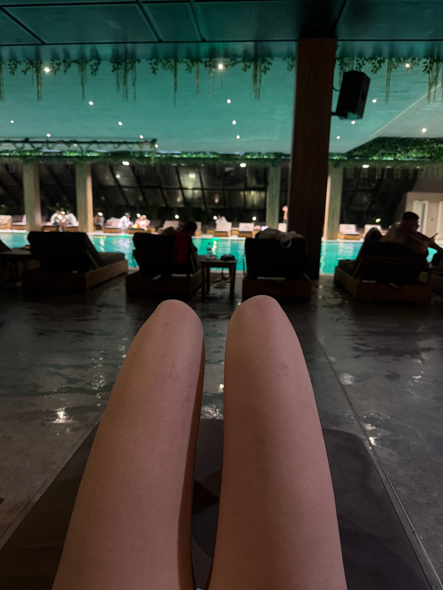 The image shows a person's legs in the foreground, while in the background there is an outdoor seating area with people, tables, chairs, and a pool of water that reflects the light, creating a blurredβ¦read more