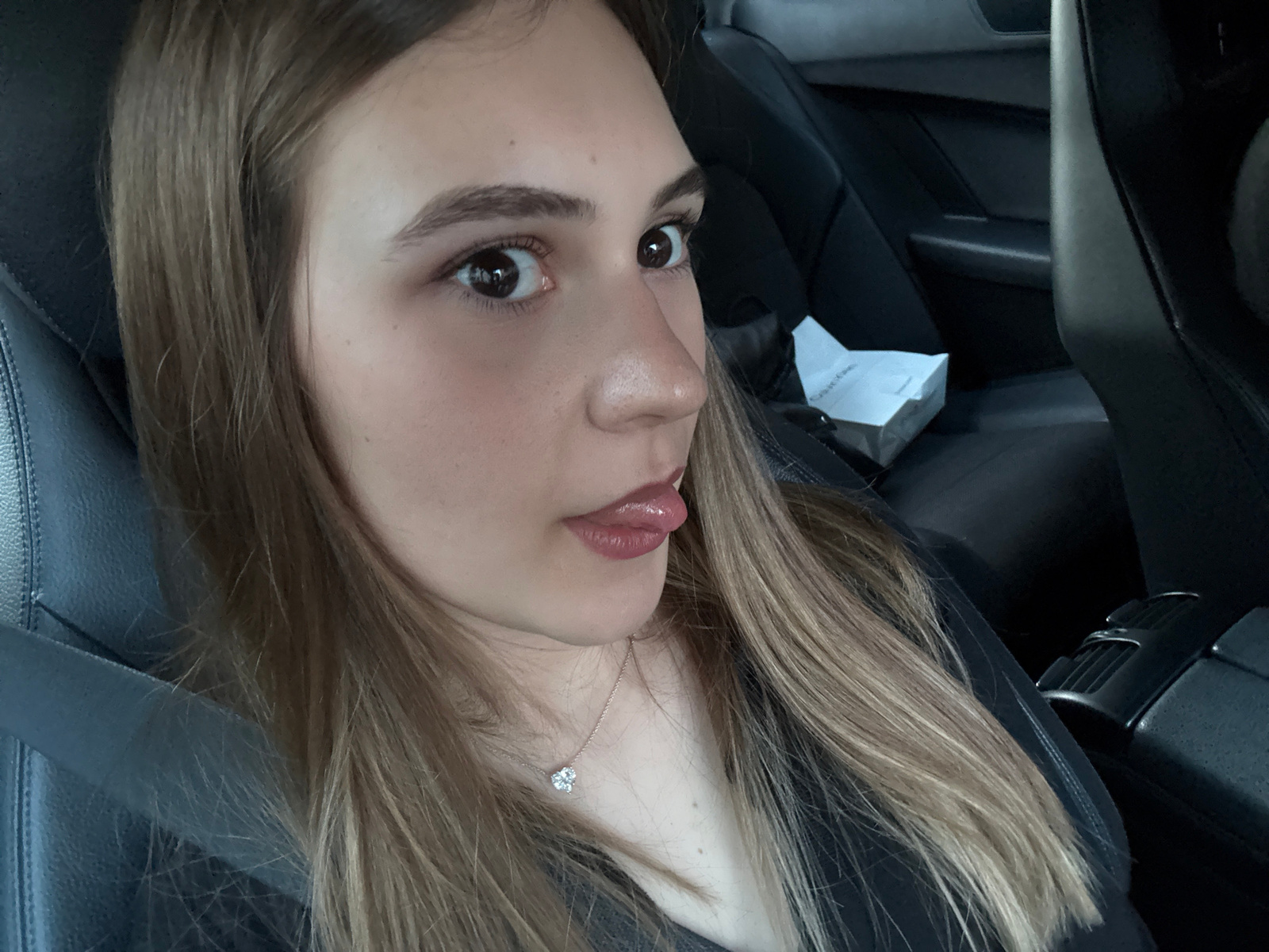 The image shows a young woman in the driver's seat of a car. She is wearing a seatbelt and sticking out her tongue. She has long, light brown hair and a silver necklace. A small white box sits on the…read more