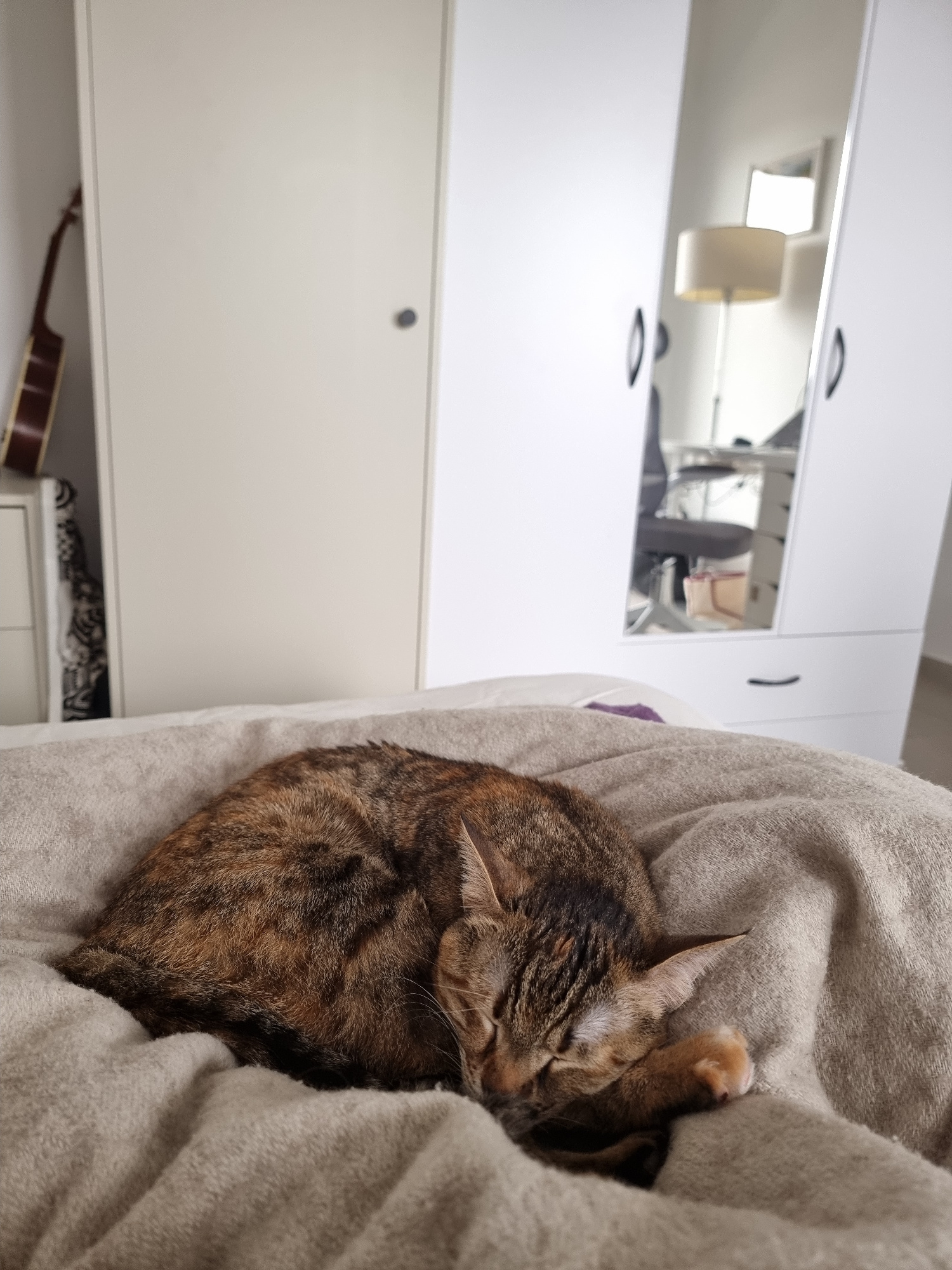 The image shows a brown tabby cat sleeping curled up on a light-colored blanket or cushion. The setting appears to be indoors, with a built-in wardrobe or cabinet visible in the background. The wardro…read more