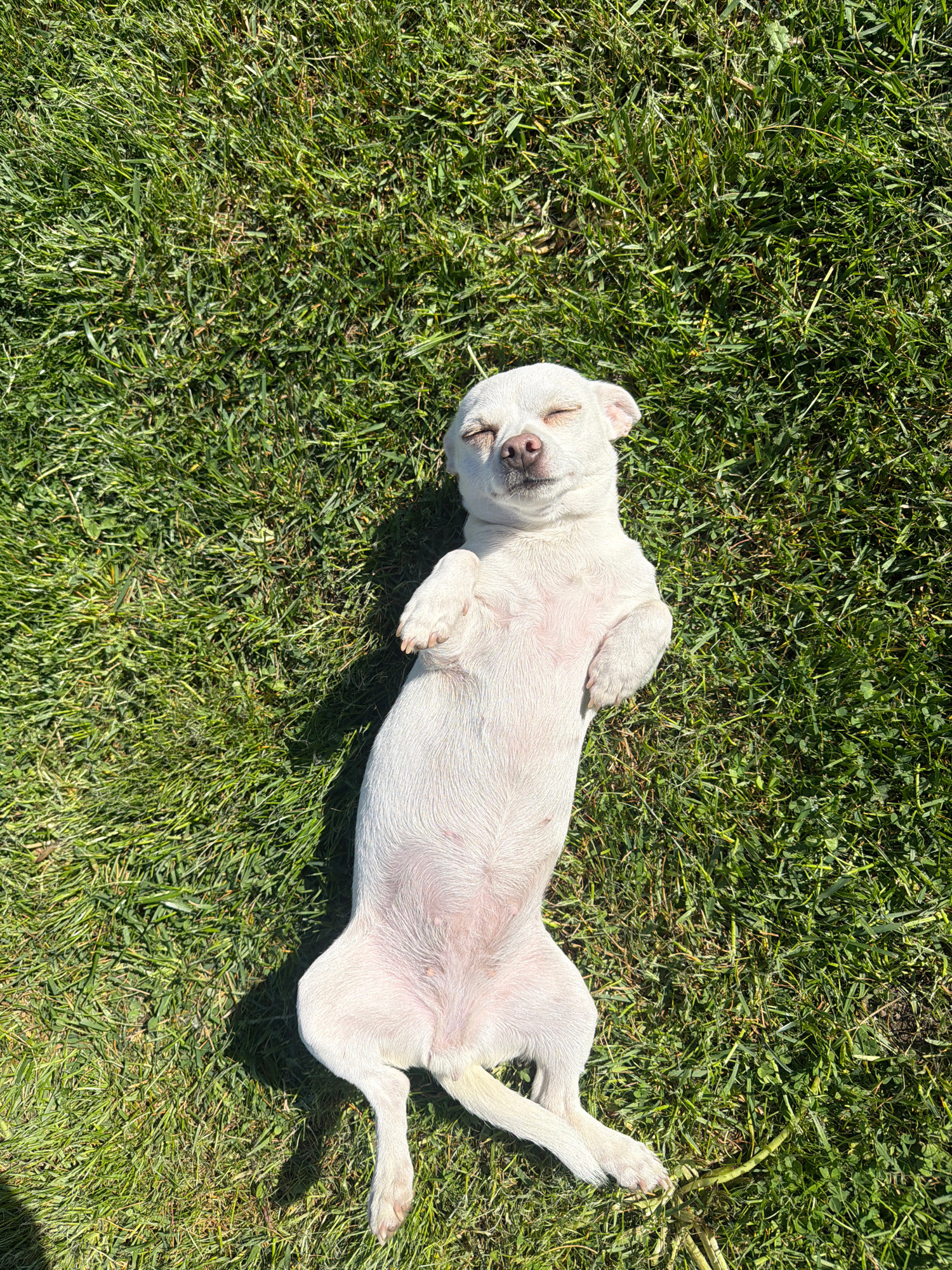 A white dog, possibly a chihuahua mix, is lying on its back in a grassy area. The dog's eyes are closed, suggesting it is sleeping or resting. The grass is green and appears to be well-maintained. The…read more