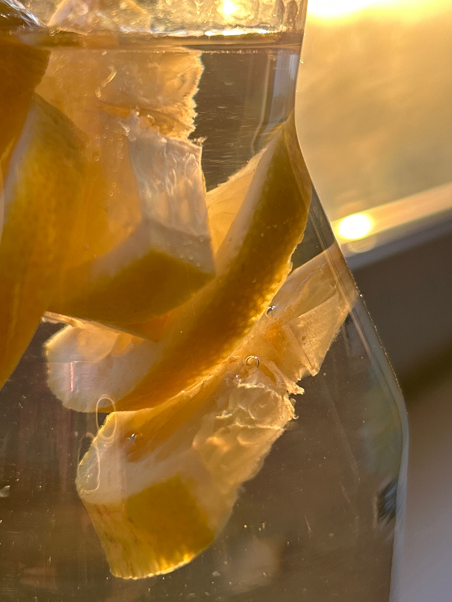 This close-up image captures several pieces of lemon peel and segments of lemon submerged in a clear liquid within a transparent container. The lemon pieces vary in shape and size, displaying shades o…read more