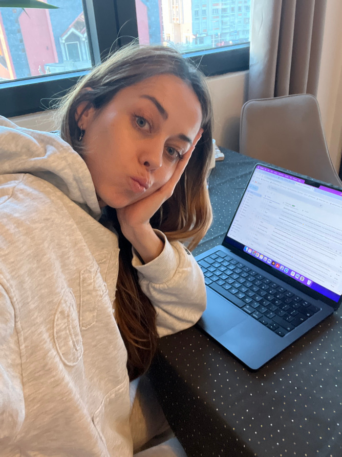 A woman in a light gray sweatshirt poses in front of a laptop on a dark, patterned surface. She rests her cheek on her hand, making a kissing face toward the camera. The laptop screen displays lines o…read more