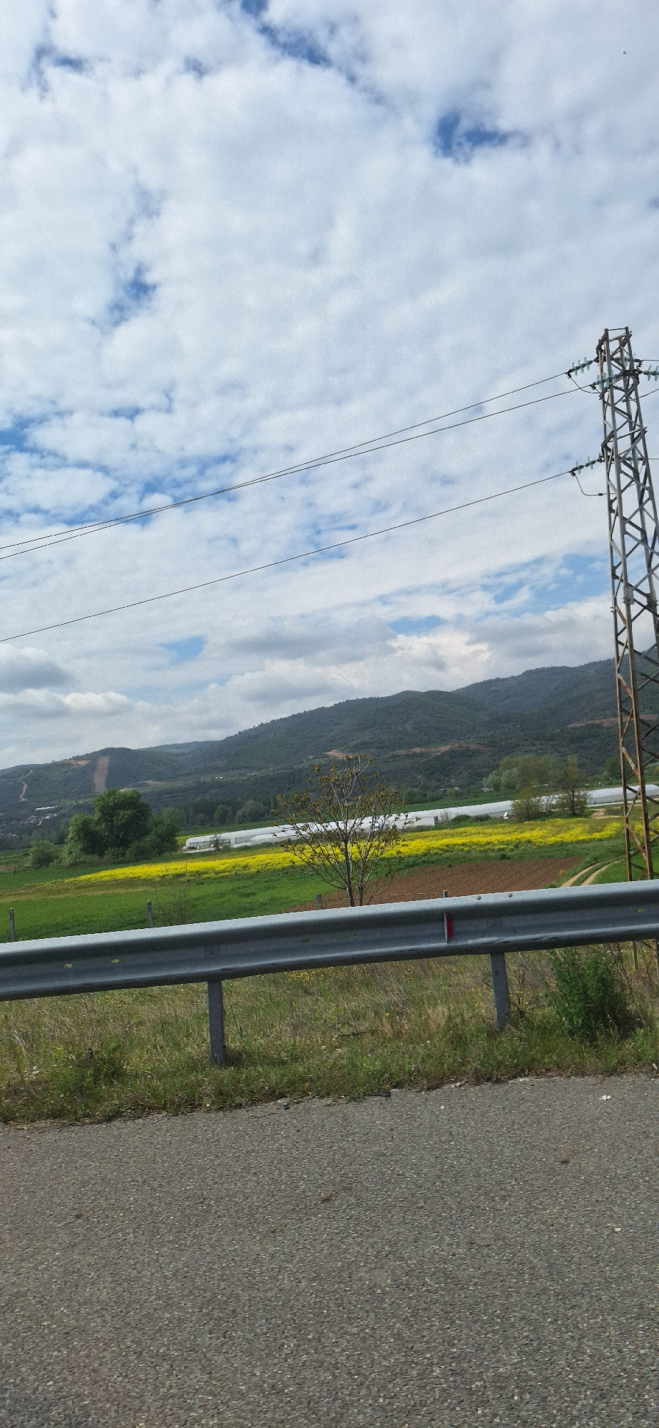 The image depicts a view of a rural landscape in Sandanski, Bulgaria. The scene is captured from the side of a road with a gray asphalt surface. A metal guardrail runs alongside the road, separating i…read more