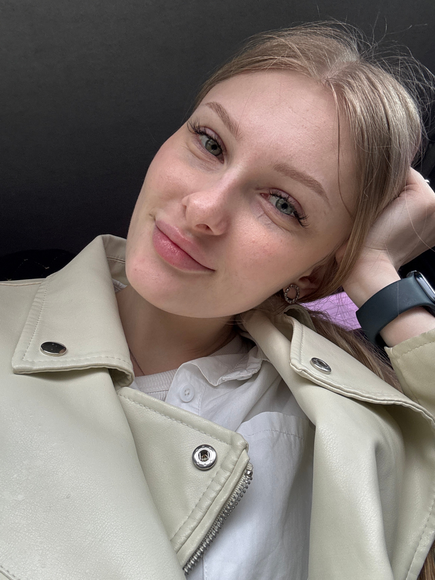 A young fair-skinned woman poses indoors, angled slightly. She wears a light cream leather jacket over a white shirt. A black smartwatch adorns her left wrist. Her hair is light brown. She is wearing…read more
