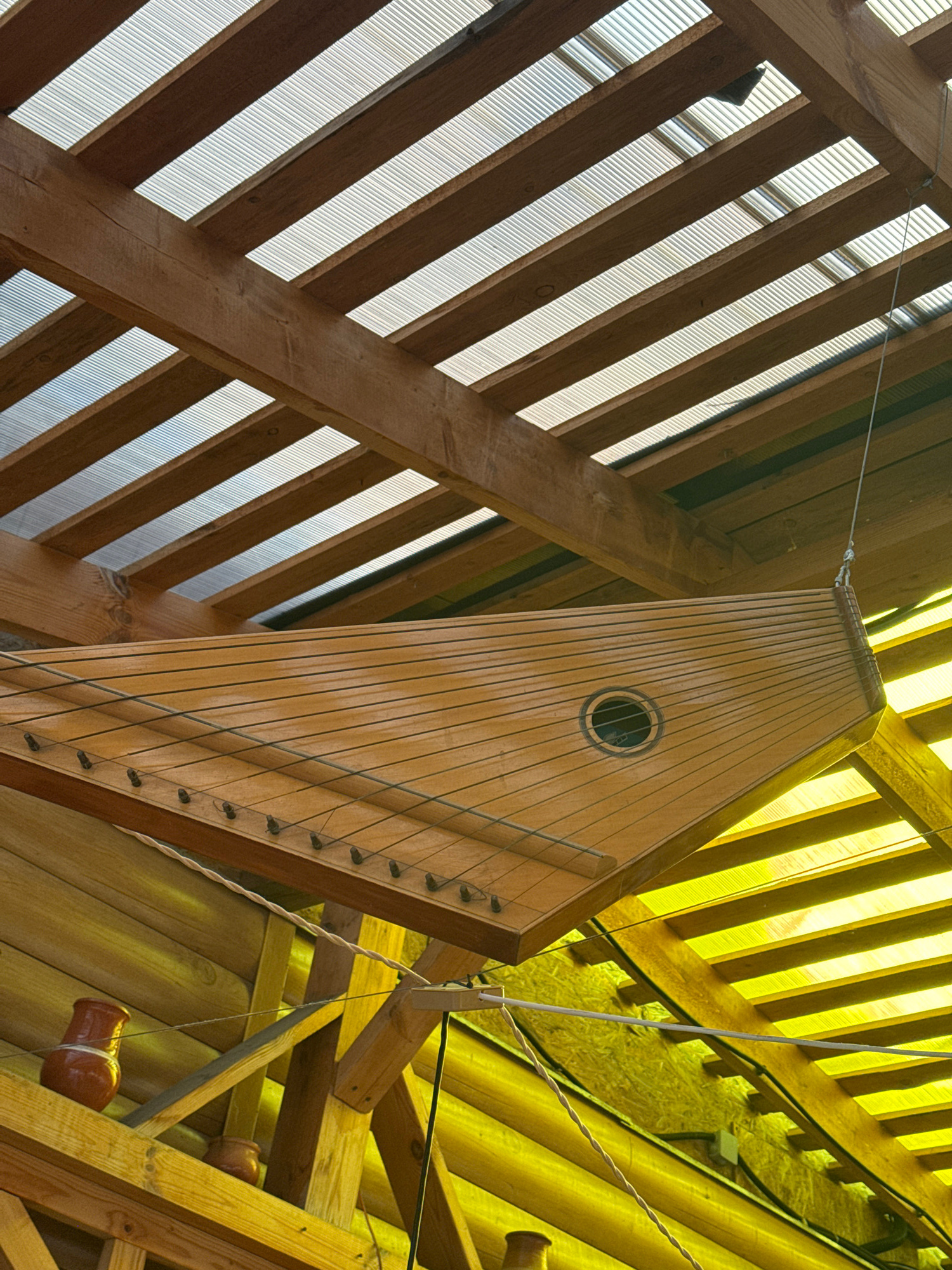 The image shows the interior of a structure, possibly a music venue or cultural center, located in Kladovitsy, Russia. A light-colored wooden harp-like instrument with multiple strings hangs suspended…read more
