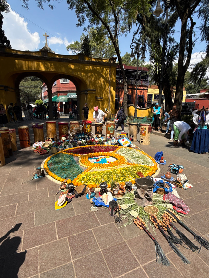 The image displays an outdoor public square in Coyoacán, Mexico City, under bright sunlight and a clear blue sky. A large, circular ceremonial offering is meticulously arranged on the reddish-brown pa…read more