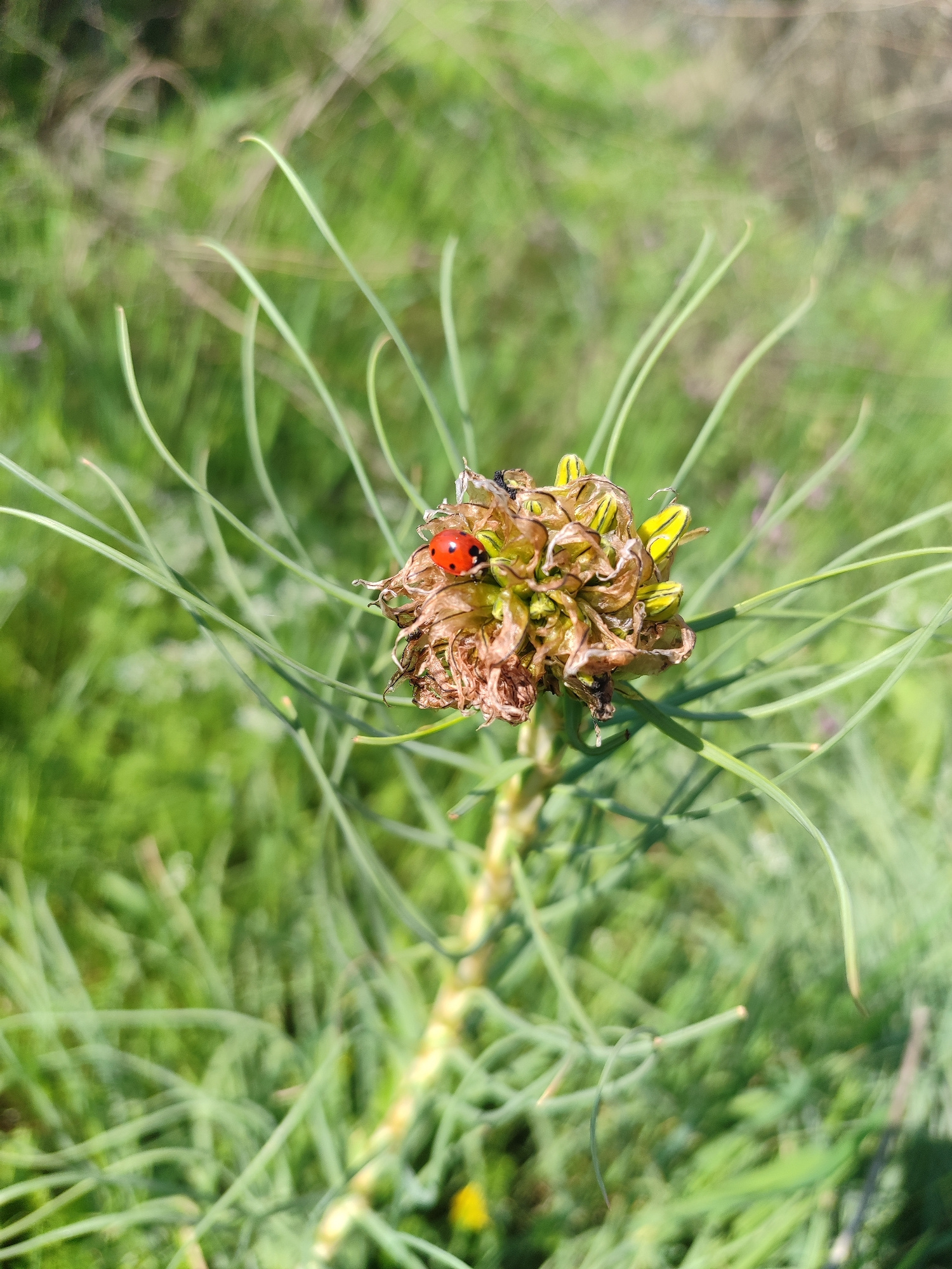 A close-up, eye-level shot shows a seedhead of an Allium plant with thin, grass-like foliage. The seedhead has dried, papery, brown bracts with some segments showing a yellow color. A red ladybug with…read more