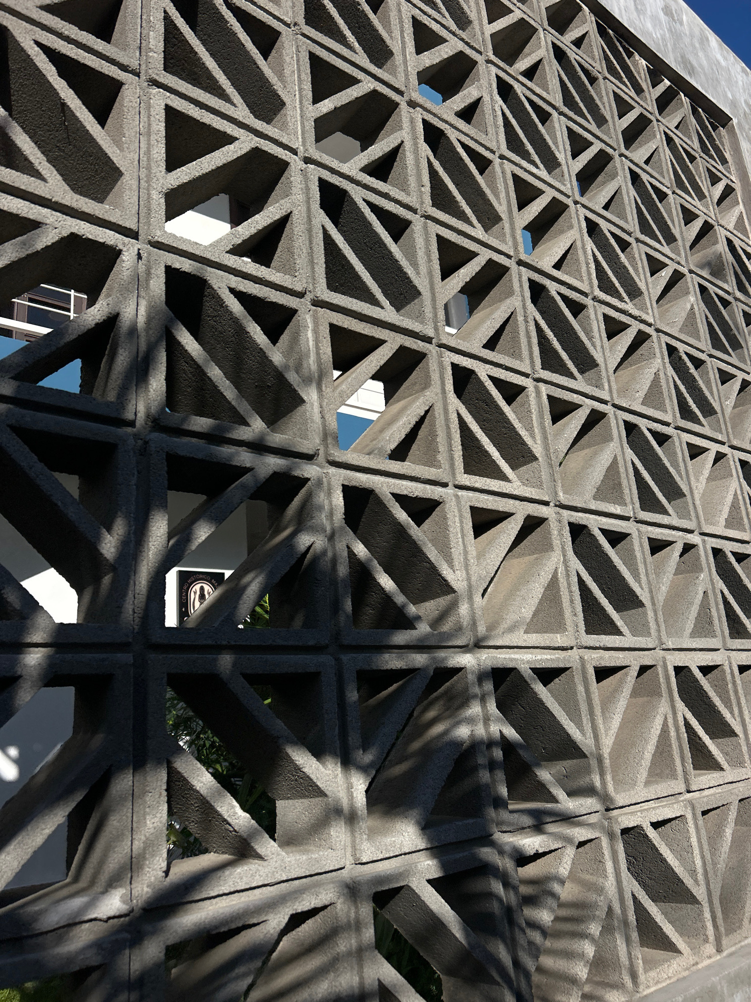 A closely framed image depicts a concrete breeze block wall in Mazatlán, Mexico, likely part of a building facade. The wall is composed of a repeating pattern of square modules, each containing four t…read more