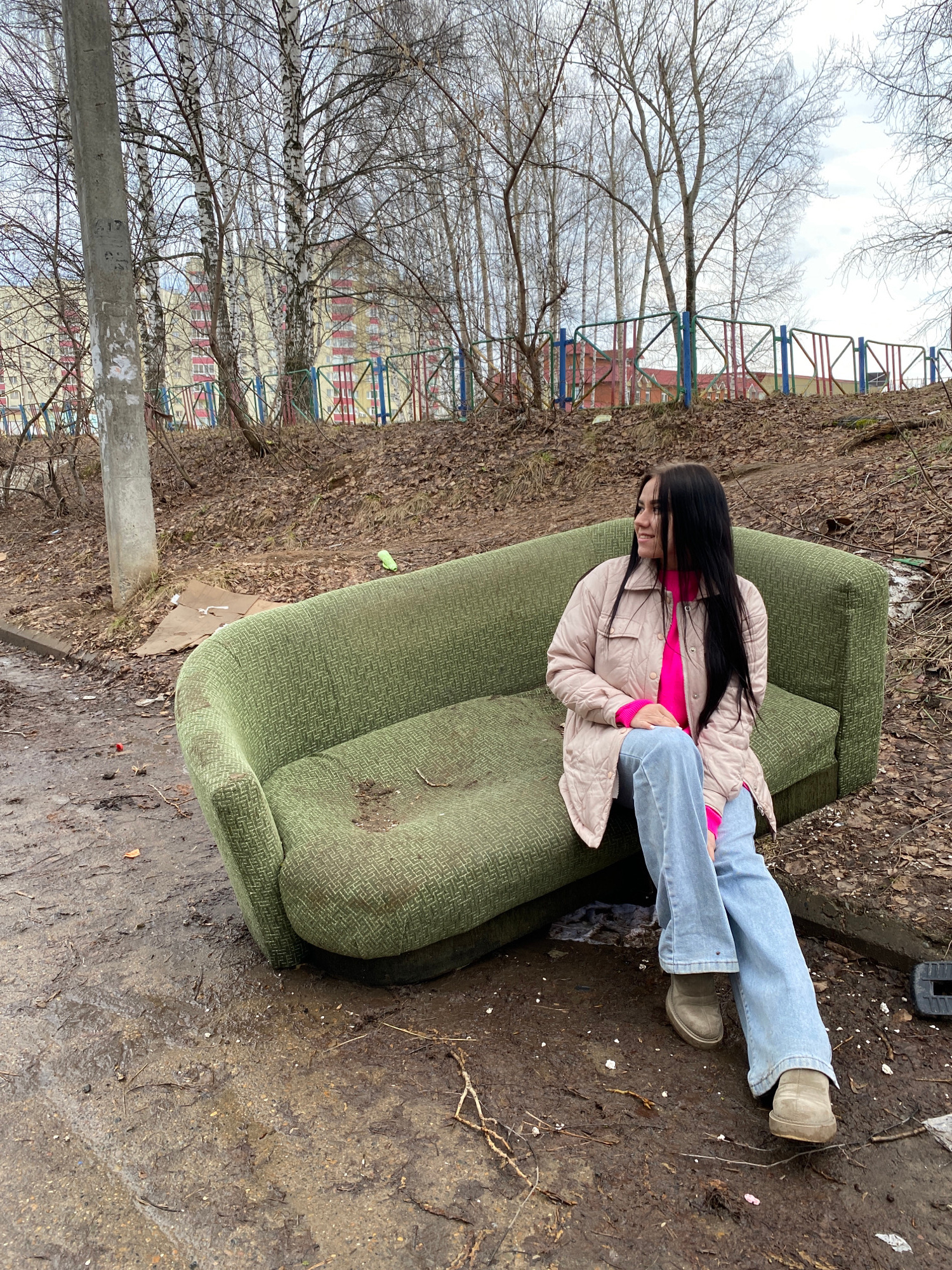 A young woman is sitting on a green couch in what appears to be a neglected urban environment. She has long, dark hair and is wearing a pink sweater under a light-colored jacket, light blue jeans, and…read more